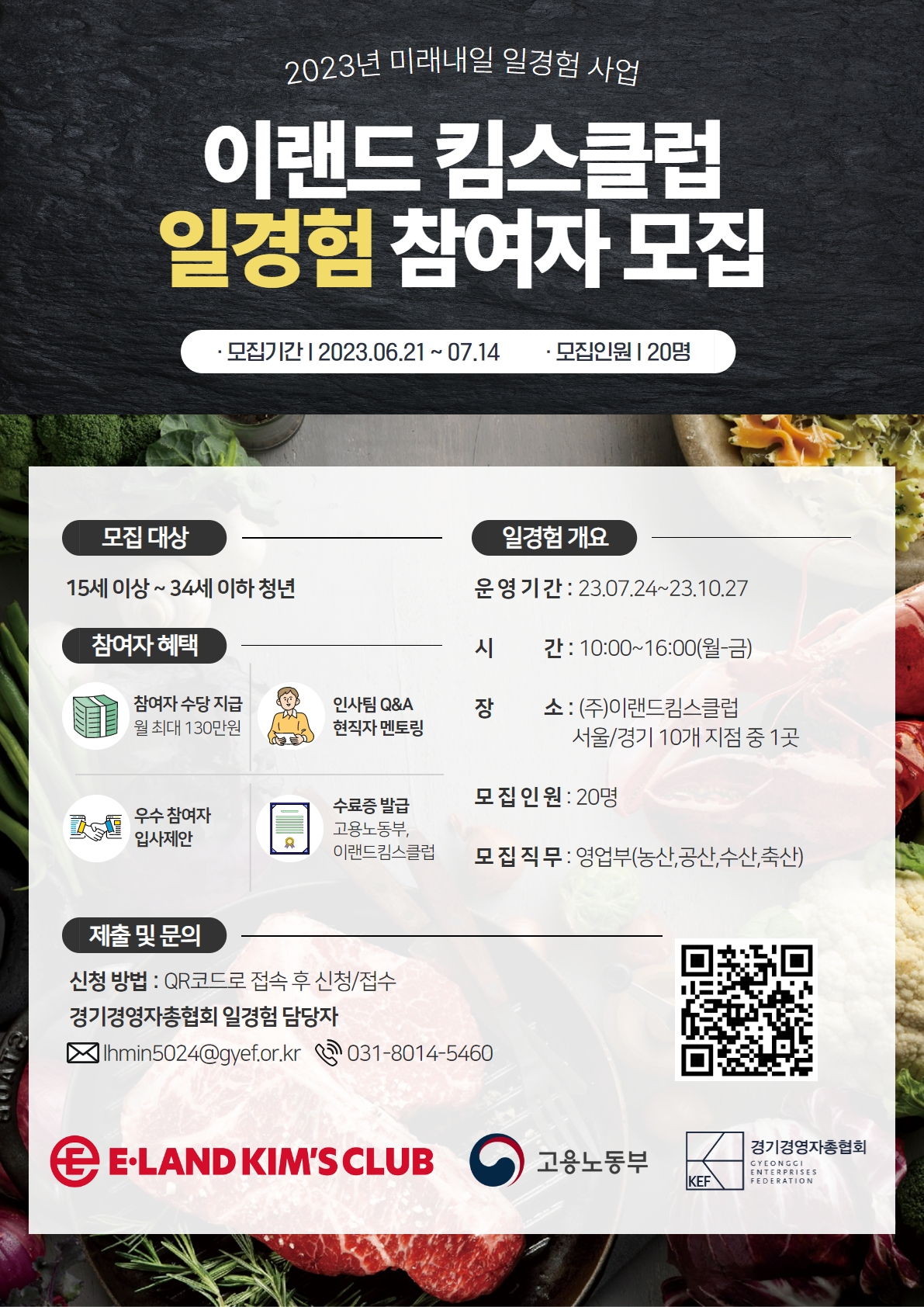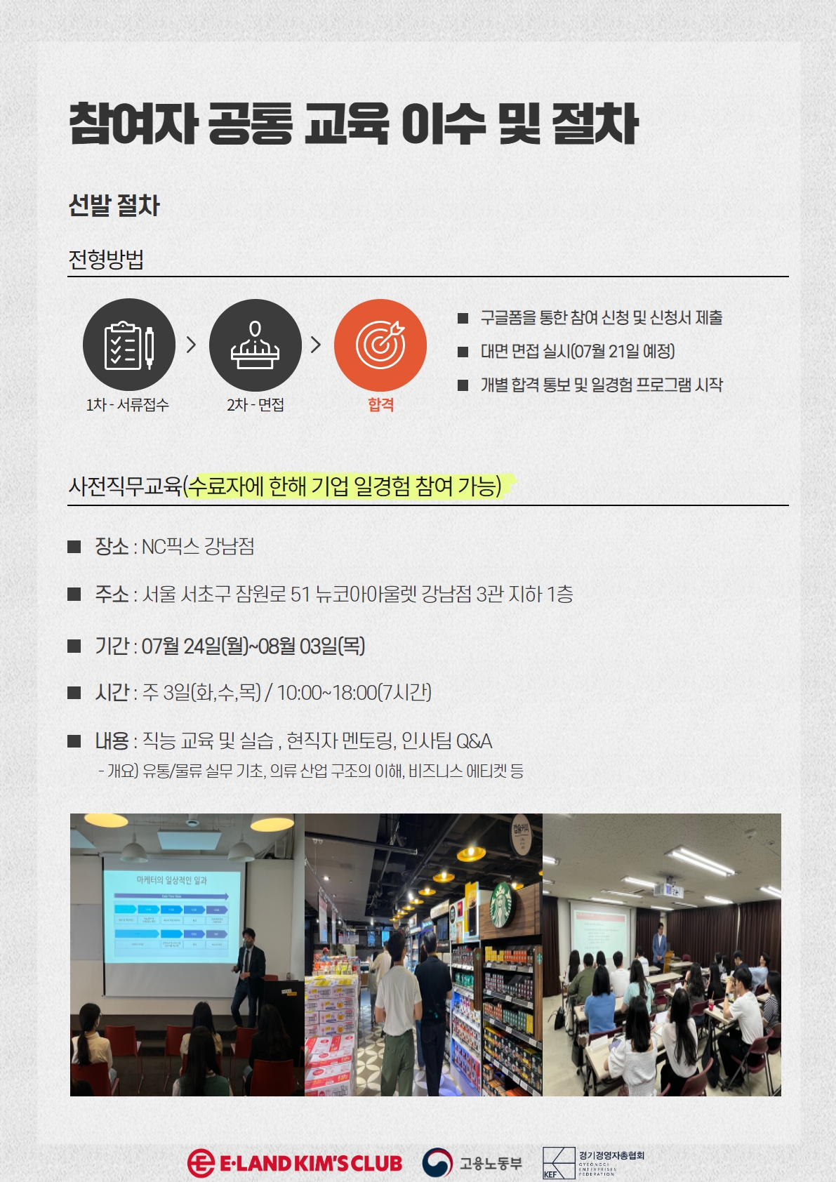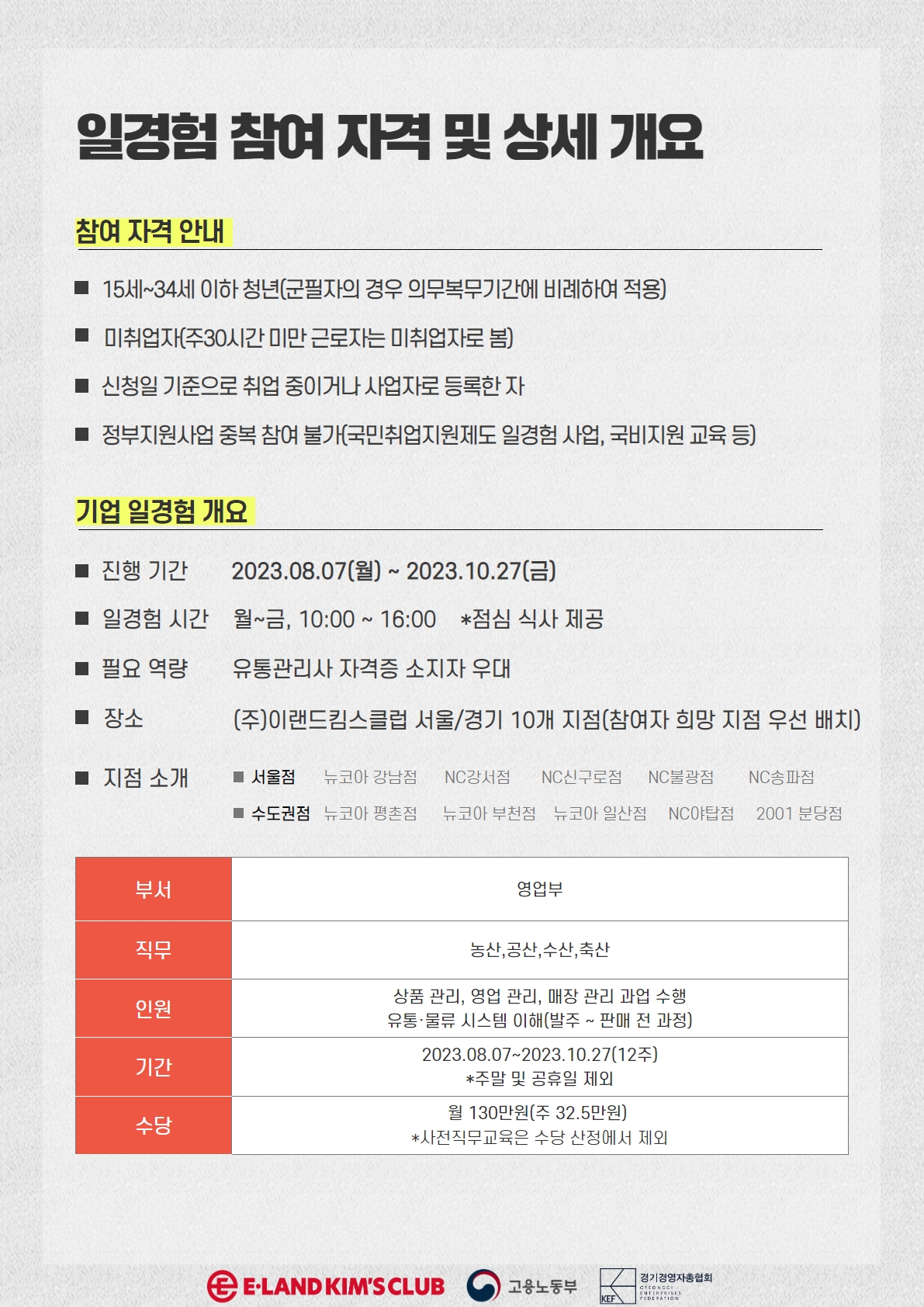 - 기업 일경험 (사전 직무교육 수료 후 12주) : 2023.08.07(월) \~ 2023.10.27(금) / (주)이랜드킴스클럽 서울/경기 10개 지점(참여자 희망 지점 우선 배치) 서울점 - 뉴코아 강남점 / NC강서점 / NC신구로점 / NC 불광점 / NC송파점 수도권점 - 뉴코아 평촌점 / 뉴코아 부천점 / 뉴코아 일산점 / NC 야탑점 / 2001 분당점
