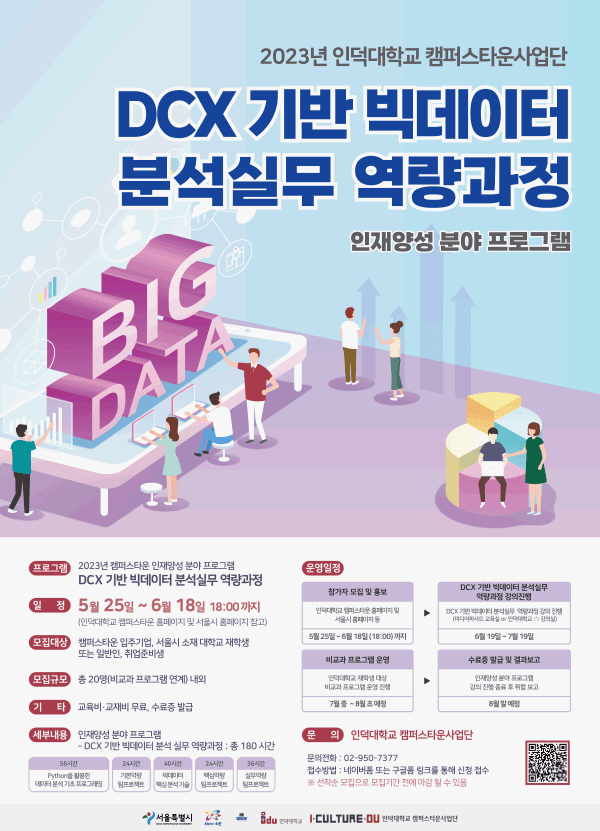 ● 모집개요 - 고객 경험 기반 데이터 분석 및 시각화, 서비스 기획 및 제공 프로젝트 실습을 통해 기업의 실무를 수행이 가능한 빅데이터 산업 분야에서 요구하는 실무형 신기술 미래 인재 양성 과정 ● 기간 및 일정 - 교육기간 : 2023년 6월 19일(월) \~ 7월 19일(수) (총 180시간) 9시 – 18시(단, 7월 19일 9시-13시)