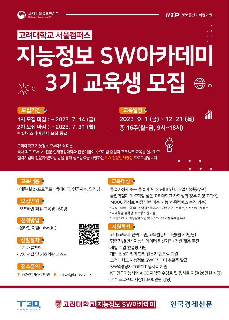 고려대학교 지능정보 SW아카데미에서는 SW기술, 인공지능 역량을 갖춘 융합형 데이터 전문 SW인재를 양성하기 위해 3기 교육생을 모집하고 있습니다.💻