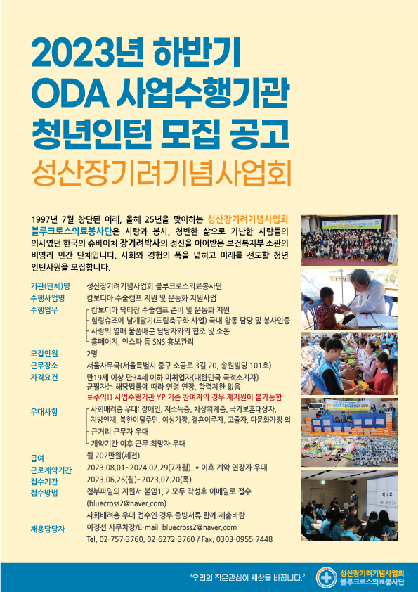 ▶접수 : 2023.06.26(월)\~07.20(목) ▶모집인원 : 2명 ▶자세한 내용 및 접수 방법은 아래의 홈페이지 링크를 통해 확인 부탁드립니다. http://www.bluecross.or.kr/bbs/notice/89011 (커뮤니티>공지사항>해당 게시글 및 첨부파일 확인) ▶문의 : 02-757-3760/02-6272-3760