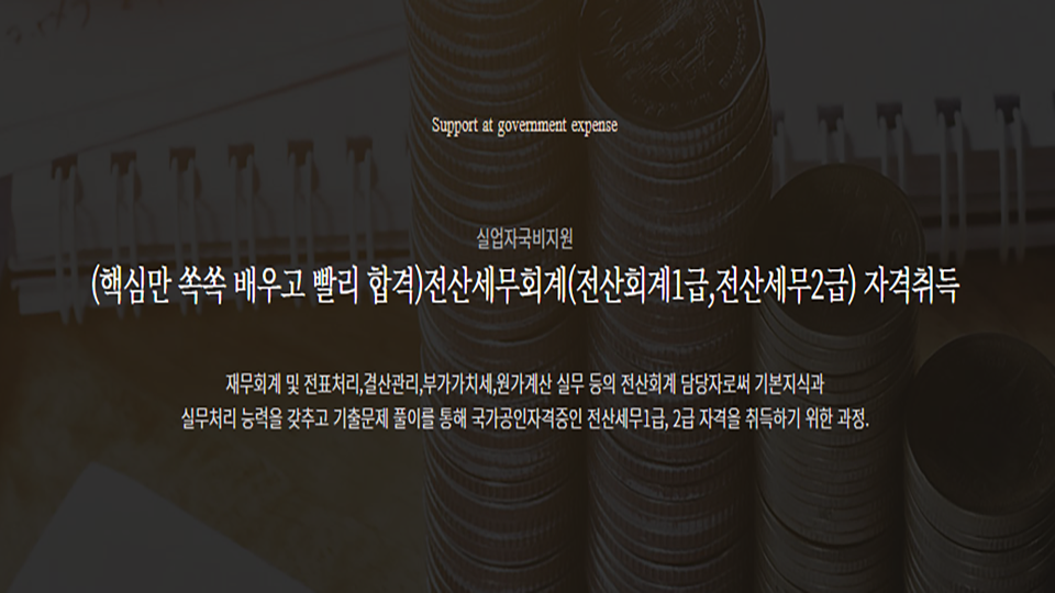 🏆직업능력 우수훈련기관(5년 인증기관)🏅 📢 2023-10-08 시험 대비 ⏰ 2023.08.01 \~ 2023.09.12 (14:30\~18:30,월\~금) ✅회계원리부터 전산회계1급, 전산세무2급 한꺼번에 두개 자격증 취득 준비 ✅실업자, 재직자 모두 수강 가능 ✅전문직업상담사 취업지원 ✅선착순 마감/가등록 필수