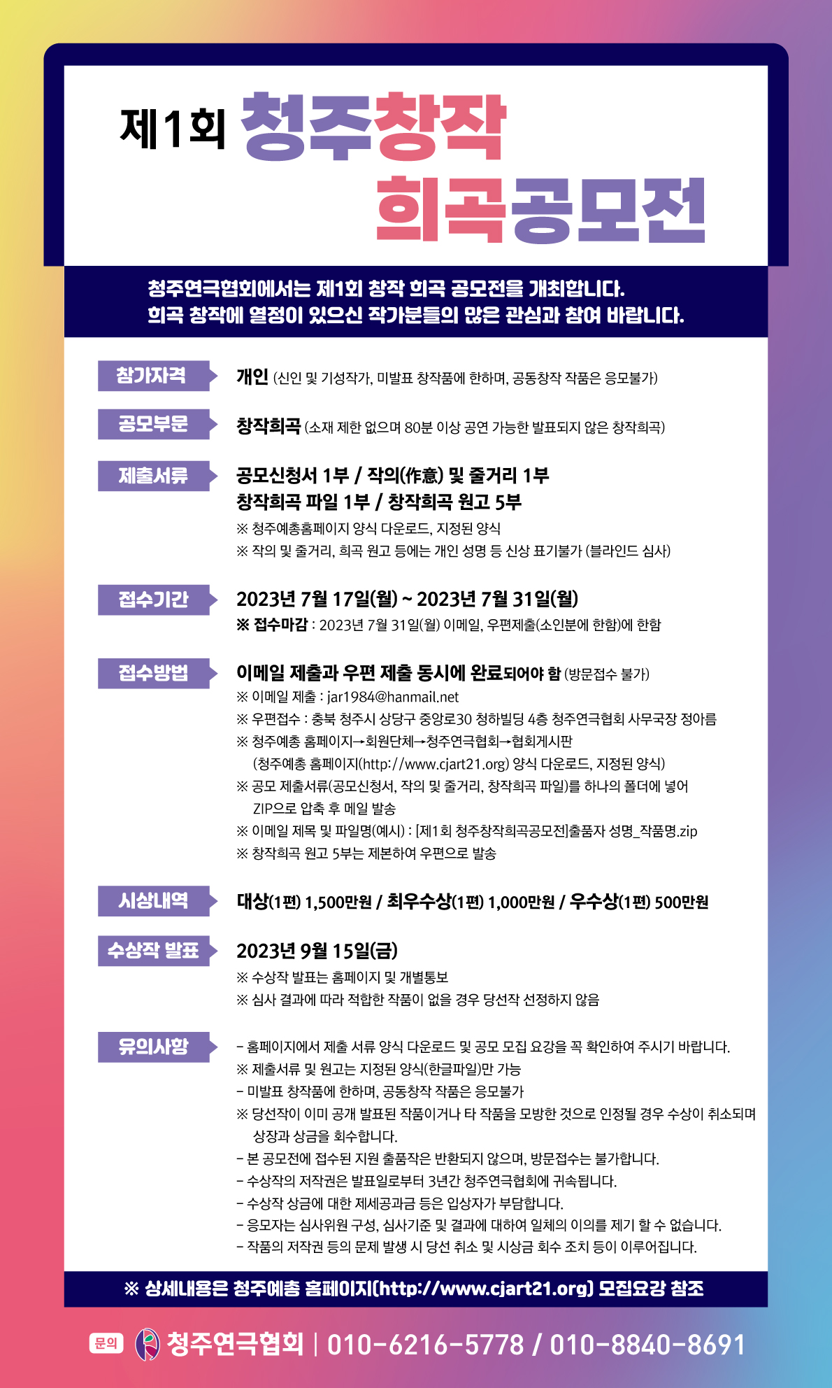 - 우편 제출 : 충북 청주시 상당구 중앙로30 청하빌딩 4층 청주연극협회 사무국장 정아름