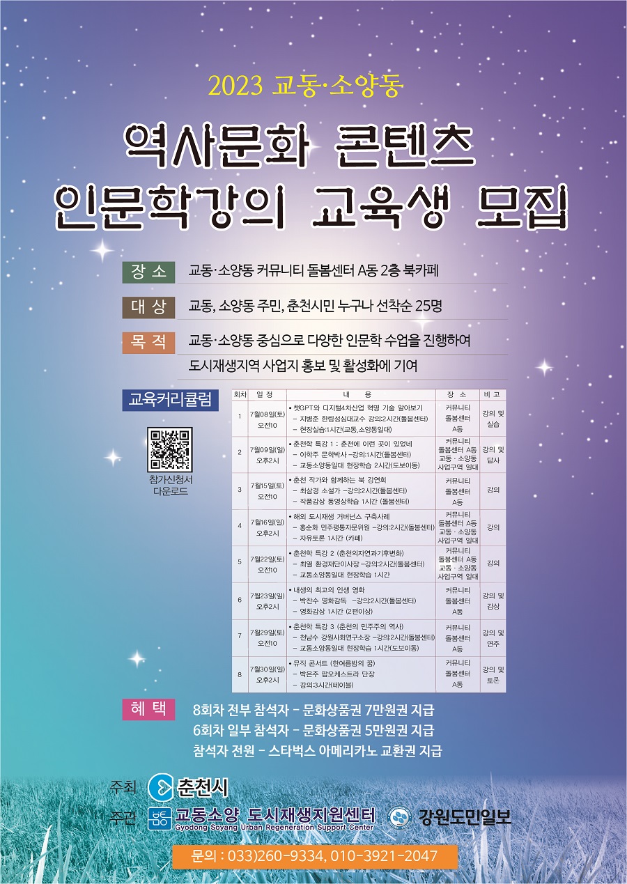 ○ 대상 : 교동, 소양동 주민 / 춘천시민 누구나 선착순 25명 ○ 목적 : 교동, 소양동 중심으로 다양한 인문학 수업을 진행하여 도시재생지역 사업지 홍보 및 활성화에 기여 ○ 혜택 8회차 전부 참석자 - 문화상품권 7만원권 지급 6회차 일부 참석자 - 문화상품권 5만원권 지급 참석자 전원 - 스타벅스 아메리카노 교환권 지급