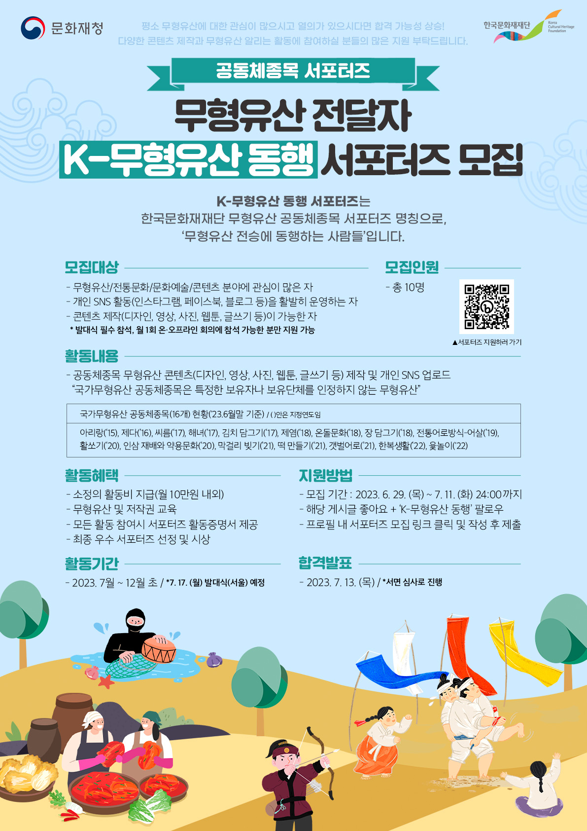 ⠀ 2023 공동체종목 서포터즈, 무형유산 전달자! ‘K-무형유산 동행’ 서포터즈를 모집합니다. ⠀ 평소 무형유산에 대한 관심이 많고 열의가 있다면 누구나 참여할 수 있습니다! 다양한 콘텐츠 제작과 무형유산을 알리는 활동에 참여하실 분들의 많은 지원 부탁드립니다. ⠀ 💡모집대상💡 - 무형유산/전통문화/문화예술/콘텐츠 분야에 관심이 많은 자 - 개인 SNS 활동(인스타그램\, 페이스북\, 블로그 등)을 활발히 운영하는 자 - 콘텐츠 제작(디자인\, 영상\, 사진\, 웹툰\, 글쓰기 등)이 가능한 자 * 발대식 필수 참석, 월 1회 온·오프라인 회의에 참석 가능한분만 지원 가능 ⠀ 💡모집인원💡 총 10명 ⠀ 💡활동기간💡 2023년 7월 \~ 12월 초 /*7.17.(월) 발대식(서울) 예정 ⠀ 💡활동내용💡 공동체종목 무형유산 콘텐츠(디자인, 영상, 사진, 웹툰, 글쓰기 등) 제작 및 개인 SNS 업로드 ⠀ 💡활동혜택💡 - 소정의 활동비 지급(월 10만원 내외) 💸 - 무형유산 및 저작권 교육 ✏ - 모든 활동 참여시 서포터즈 활동증명서 제공 📖 - 최종 우수 서포터즈 선정 및 시상🎊 ⠀ 💡지원방법💡 - 모집 기간 : 2023. 6. 29.(목) \~ 7. 11.(화) 24:00까지 - 해당 게시글 좋아요 + ‘K-무형유산 동행’ 팔로우 - 프로필 내 서포터즈 모집 링크 클릭 및 작성 후 제출 ⠀ 💡합격발표💡 - 2023년 7월 13일(목) / *서면 심사로 진행 ⠀ 💡관련문의💡 gr.kim@thinkingwolf.co.kr 로 아래 양식으로 문의 부탁드립니다. - 문의 내용 / 이름 / 연락처 - 평일 10:00\~18:00 - 토\, 일\, 공휴일 휴무