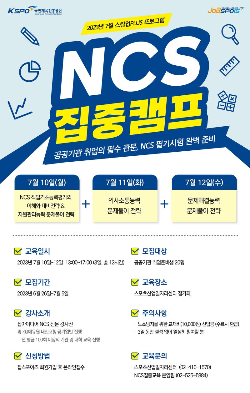 [국민체육진흥공단 - 잡스포이즈] 공공기관 필기시험 대비를 위한 'NCS 집중캠프(대면)' 참여자 모집 (\~7/5, 선착순 모집)