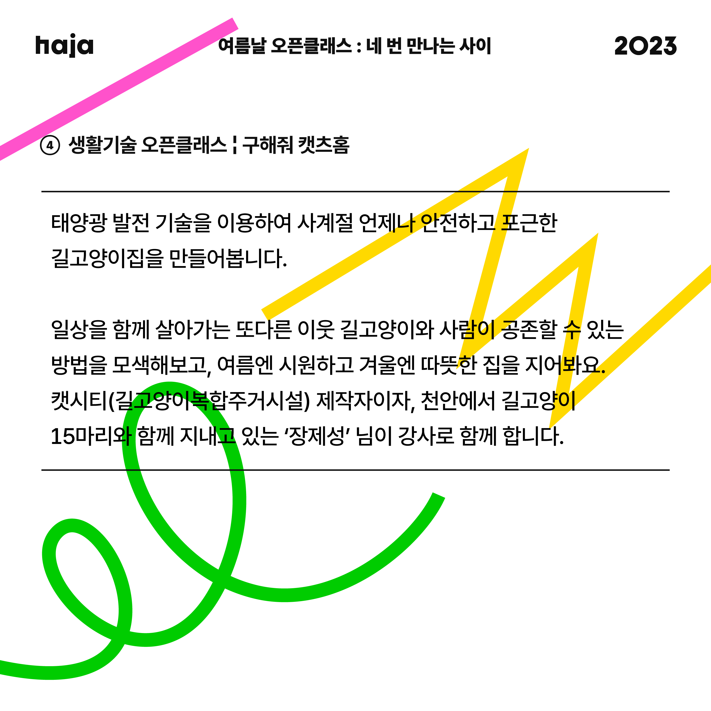 생활기술 오픈클래스 : 구해줘 캣츠홈 태양광 발전 기술을 이용하여 사계절 언제나 안전하고 포근한 길고양이집을 만들어봅니다. 일상을 함께 살아가는 또다른 이웃 길고양이와 사람이 공존할 수 있는 방법을 모색해보고, 여름엔 시원하고 겨울엔 따뜻한 집을 지어봐요. 캣시티(길고양이복합주거시설) 제작자이자, 천안에서 길고양이 15마리와 함께 지내고 있는 ‘장제성’ 님이 강사로 함께 합니다.