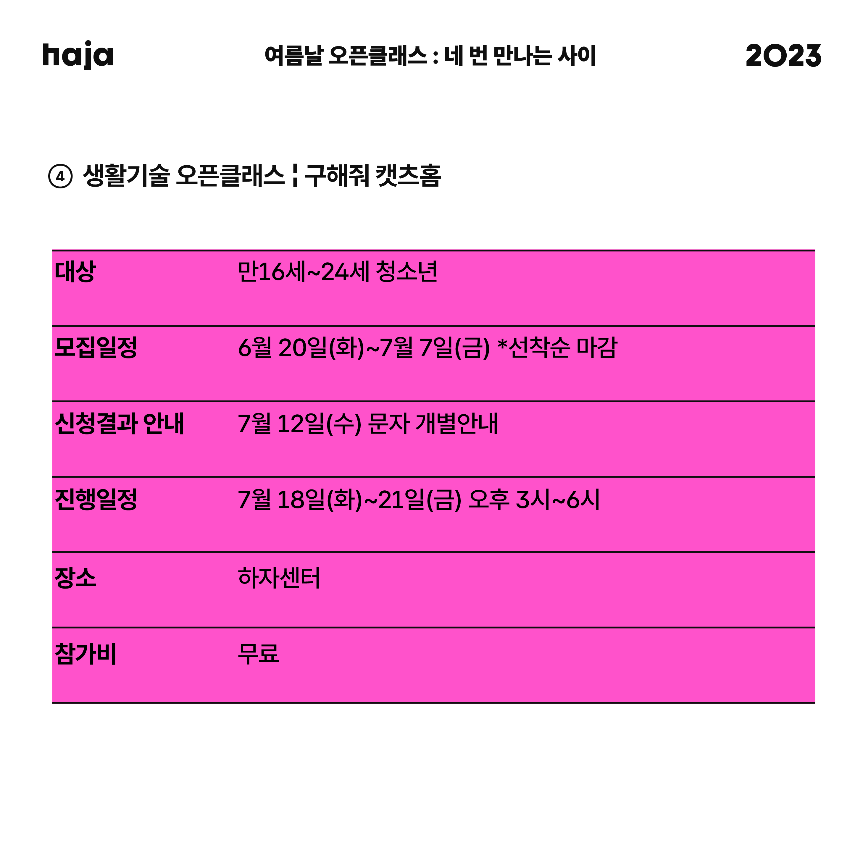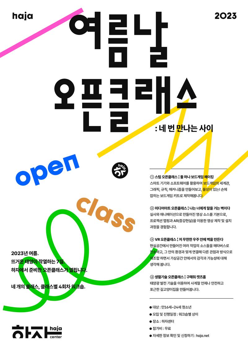 2023년. 여름. 뜨거운 태양이 작열하는 7월. 하자에서 준비한 오픈클래스가 열립니다. 네 개의 클래스, 4회차로 구성된 프로그램, 여름날 오픈 클래스 : 네 번 만나는 사이