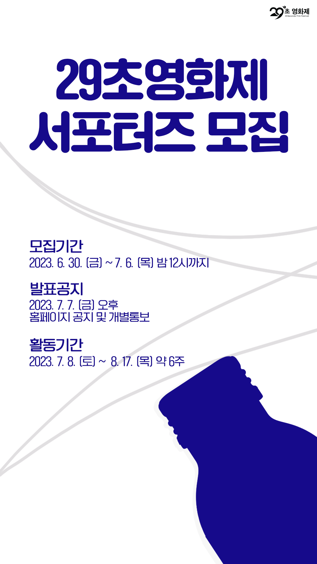 ■ 모집대상: 29초영화제 및 영상제작에 관심이 많은 분 ■ 모집기간: 2023.6.30.(금) \~ 2023.7.6.(목) 밤 12시까지 ■ 활동기간: 2023.7.8.(토) \~ 2023.8.17.(목) (약 6주) ■ 활동내용 - 일반부 또는 청소년부 출품 - 홍보/NG/메이킹필름 출품 ■ 활동혜택 [서포터즈 전원] ① 팀당 활동비 지원 : 팀으로 지원한 경우, 활동비는 팀 대표자에게 지급됩니다. ② 수료증 발급 : 팀으로 지원했더라도 수료증은 팀원 모두에게 개별적으로 발급됩니다. : PDF 파일형태로 제공되며, 실물로는 발급되지 않습니다. [우수서포터즈] ① 한경미디어그룹 영상콘텐츠 계열사 ‘한경디지털랩’ 입사지원 시 우대 ② ‘한경ARTE필하모닉 더클래식 2023’ 공연초대 ③ 후속 영화제 서포터즈 지원 시 우대 *우수서포터즈의 경우, 활동내용(성실도/출품작 수/콘텐츠 완성도 등)을 바탕으로 종합평가해 선정합니다. ■ 문의처: 카카오톡 채널 ‘29초영화제’ 친구추가 후 채팅문의 또는 29초영화제 홈페이지 1:1문의 선정되신 분들은 7월 7일(금) 오후, 29초영화제 공식 홈페이지 및 개별연락을 통해 결과를 확인하실 수 있습니다. 감독님들의 많은 지원 바랍니다💪💪