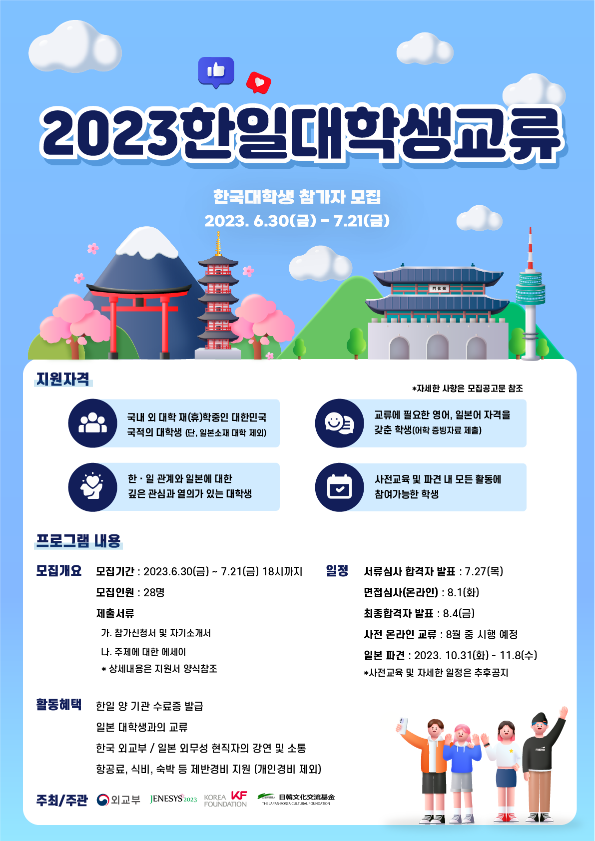 한-일 양국 정부는 양국 문화의 상호이해 및 우호증진을 위해 1972년부터 양국 대학생간 교류 사업을 시행하고 있습니다. 이에, 2023년도 교류계획에 따라 일본을 방문할 한국 대학생 대표단을 선발합니다. '2023 한일대학생교류 프로그램'을 통해 민간외교관의 자세를 가지고 한일교류 활동에 적극적으로 임할 학생들의 많은 참여를 기다립니다. ■ 사업 목적: 한-일 청년 간 소통 강화와 양국에 대한 이해 제고를 통해 미래지향적인 양국 관계 발전에 기여 ■ 사업 일정: 방한 2023.9.11.(월) \~ 9.19.(화) / 방일 2023.10.31.(화) \~ 11.8.(수) * 오프라인 사전교육 및 온라인교류회 예정 ■ 선발 일정** o 모집기간 : 2023.6.30.(금) - 7.21.(금) 18시까지 o 류심사 합격자 발표 : 2023.7.27.(목) o 면접심사(온라인) : 2023.8.1.(화) o 최종 합격자 발표 : 2023.8.4.(금) o 방일단-방한단 사전 온라인 교류 : 8월 중 시행 예정 o 사전교육 : 10월 중 시행 예정 o 방한단과의 만남 : 추후 공지 예정 o 방일파견 : 2023.10.31.(화)-11.8(수) o 해단식 : 11월 중 (최종보고회, 우수학생 선발) ※ 선발대상 및 신청방법은 한국국제교류재단(KF) 홈페이지 링크에서 확인 ■ 모집 기간: 2023.6.30.(금) - 7.21.(금) 18시까지 ■ 모집링크** o https://www.kf.or.kr/kf/na/ntt/selectNttInfo.do?mi=1131&bbsId=1051&nttSn=119175 ■ 지원 방법: ※ 본 공고에 첨부된 지원서 양식 작성 후 이메일 제출 o 접수처: sojung.k@fairtravelkorea.com(전화 문의는 받지 않습니다) o 파일명: 2023 한일대학생교류사업 한국대표단 지원자 000 ■ 선발 인원 및 기준** 가. 선발 인원: 28명 나. 선발 기준 o 한일관계와 일본에 대한 깊은 관심과 열의가 있는 대학 재․휴학생 - 3개월 이내의 총장명의 직인이 찍힌 재적증명서 제출 필수 o 교류에 필요한 영어, 일본어 자격을 갖춘 학생 - (일본어) JLPT4급 이상, JPT500점 이상 - (영어) 토익 600점 이상, 토익스피킹 LV5 이상, 오픽 IM 이상 등 * 영어, 일본어 중 1개 자격조건만 충족하면 지원 가능 o 대한민국 국적으로 해외 파견에 결격 사유가 없는 자 o 재단이 요구하는 과제 제출이 가능한 학생 (종료 보고서, 최종 성과보고회 발표자료) o 사전교육 및 파견 내 모든 활동에 참여 가능한 학생 * 사전 교육에 불참시 참여에 제한이 있을 수 있음 o 파견 전 여권 원본 제출이 가능한 학생 (여권 유효기간 확인 필수) o (우선선발) 최근 2년 간 일본 방문 경험이 없는 학생, 방한단과의 만남에 참석 가능한 학생, 사회적 배려자 (*증명서류 제출 필수) ■ 활동 혜택** o 기관 부담: 왕복 항공료, 일본 체재비(교통비, 숙식비, 입장료 등), 사전교육 관련 비용(교통비 등) ■ 참고** o 해당 파견은 학기 중 시행되므로 미리 본인의 학사 일정 조정 필요 ■ 기관정보** o 주최: 한국외교부, 일본외무성 o 주관: 한국국제교류재단, 일한문화교류기금 o 협력: (주) 공감만세