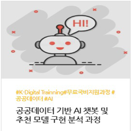 [KG에듀원 아이티뱅크] 과정명 : 공공데이터 기반 AI 챗봇 및 추천 모델 구현 분석 과정 교육문의 : 02-3675-9738 교육일정 : 2023년 08월 03일 \~ 2024년 02월 02일 (6개월) 교육시간 : 09:00 \~ 18:00