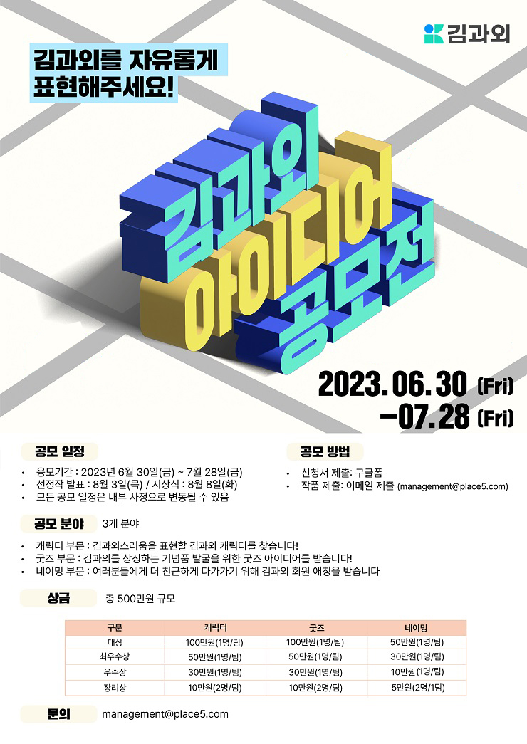 안녕하세요! 대한민국 대표 과외 플랫폼 김과외입니다.😍 제1회 김과외 아이디어 공모전은 대학생 여러분들과 함께 성장하기 위하여 소통의 장으로 기획하였습니다. 이번 공모전에서는 캐릭터, 굿즈, 네이밍 부문을 통하여 김과외에 대하여 재미있고 참신하게 표현한 여러분들의 아이디어를 공모 받고자 합니다. 저희 김과외는 보다 나은 서비스를 제공하기 위하여 여러분들의 이야기에 귀 기울이고 함께 유기적 관계를 맺으며 김과외의 성장 방향에 대하여 이야기 나누고자 합니다. 김과외는 앞으로 여러분들에게 다양한 경험의 기회를 제공하며 사회적 성장을 위해 언제나 함께하며 발전해 나가겠습니다🙏 ⚫공모일정 · 응모 기간 : 2023년 6월 30일(금) \~ 7월 28일(금) · 선정작 발표 : 8월 3일(목) · 시상식 : 8월 8일(화) (자세한 시간은 추후 안내될 예정) ※ 모든 공모 일정은 내부 사정으로 변동될 수 있음을 안내드립니다. ⚫공모대상 · 김과외 회원이라면 누구나 ⚫공모내용 · 재미있고 스마트하고 성장하는 김과외를 자유롭게 표현해주세요! 😍 ⚫접수방법 · 참가 신청서 : 구글폼 제출 (https://bit.ly/3CV1XH4) · 이미지 제출(캐릭터, 굿즈 해당) : 이메일 지원 (management@place5.com) ⚫공모 부문 ✅캐릭터 부분 · 김과외스러움을 표현할 김과외 캐릭터를 찾습니다! · #성장하는 #밝은 #재미있는 #똑부러지는 #편안한 · 응모 구분 : 개인 또는 팀 · 응모 자격 : 김과외에 회원가입이 되어 있는 자 · 접수 방법 (두 가지 모두 제출해야 참가 인정) 1) 참가 신청서 : 구글폼 제출 (https://bit.ly/3CV1XH4) 2) 이미지 제출 : 이메일 지원 (management@place5.com) 파일명 : 김과외아이디어공모전_캐릭터_개인 또는 팀명 · 작품 형식 1) JPG, JPEG, PNG 등의 이미지 파일 2) 기본형 3컷(앞, 옆, 뒤), 응용형 (포즈, 표정 등 자유 응용) 2컷 총 5컷 한 페이지 내에 표현 3) A3(420X297mm), 해상도 300dpi 이상, 가로 혹은 세로형 ✅굿즈 부문 · 김과외를 상징하는 기념품 발굴을 위한 굿즈 아이디어를 받습니다! · 종류, 형식에 상관없이 여러분들의 아이디어를 자유롭게 표현해 주세요😊 · 응모 구분 : 개인 또는 팀 · 응모 자격 : 김과외에 회원가입이 되어 있는 자 · 접수 방법 (두 가지 모두 제출해야 참가 인정) 1) 참가 신청서 : 구글폼 제출 (https://bit.ly/3CV1XH4) 2) 이미지 제출 : 이메일 지원 (management@place5.com) 파일명 : 김과외아이디어공모전_굿즈_개인 또는 팀명 (압축파일zip으로 제출) · 작품 형식 1) JPG, JPEG, PNG 등의 이미지 파일 2) 굿즈는 자유 선택 (굿즈 제작 예시 3개 이상) 3) 티셔츠, 에코백, 텀블러, 키링 등 4) A3(420X297mm), 해상도 300dpi 이상, 가로 혹은 세로형 ✅네이밍 부문 · 회원 여러분들에게 더 친근하게 다가가기 위해 김과외 회원 애칭 정하기 공모를 실시합니다! · 학생, 학부모, 선생님, 김과외 4가지 중 자유롭게 선택하여 애칭을 정해주세요😊 · 응모 구분 : 개인 또는 팀 · 응모 자격 : 김과외에 회원가입이 되어 있는 자 · 접수 방법 - 참가 신청서 및 네이밍 : 구글폼 제출 (https://bit.ly/3CV1XH4) ⚫시상 내역 [캐릭터 부문] · 대상 : 100만원 (1명/팀) · 최우수상 : 50만원 (1명/팀) · 우수상 : 30만원 (1명/팀) · 장려상 : 10만원 (2명/팀) [굿즈 부문] · 대상 : 100만원 (1명/팀) · 최우수상 : 50만원 (1명/팀) · 우수상 : 30만원 (1명/팀) · 장려상 : 10만원 (2명/팀) [네이밍 부문] · 대상 : 50만원 (1명/팀) · 최우수상 : 30만원 (1명/팀) · 우수상 : 10만원 (1명/팀) · 장려상 : 5만원 (2명/팀) ⚫공모전 혜택 · 공모전 수상자 상장, 상금 지급 · (주)플레이스5 김과외 지원 시 서류 면제 ⚫문의(이메일 문의) · management@place5.com