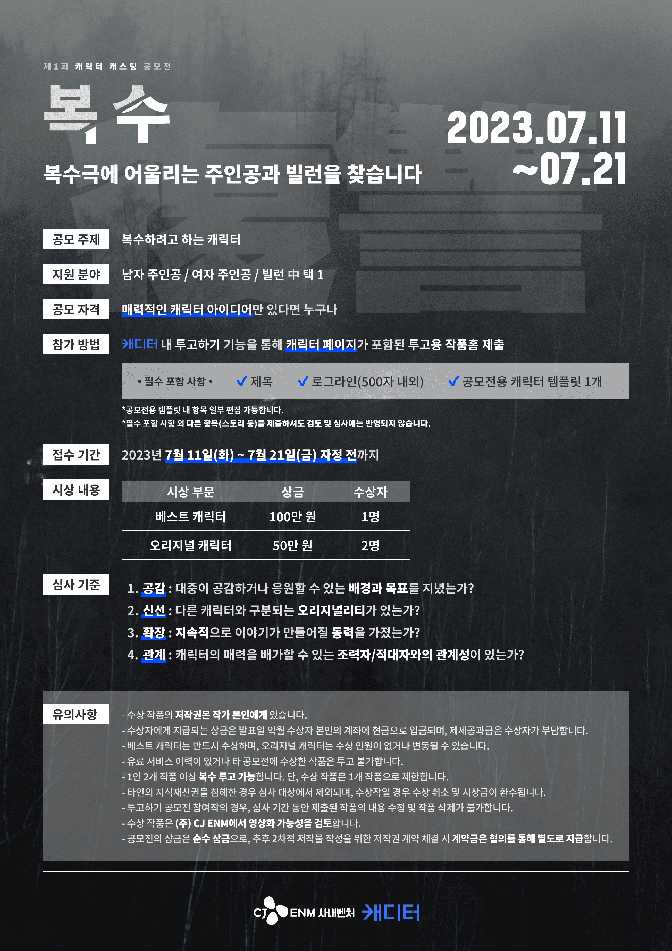 ◾️ 공모전 제목 [CJ ENM] 사내벤처 캐디터 제1회 캐릭터 캐스팅 공모전 <복수> (\~7.21)
