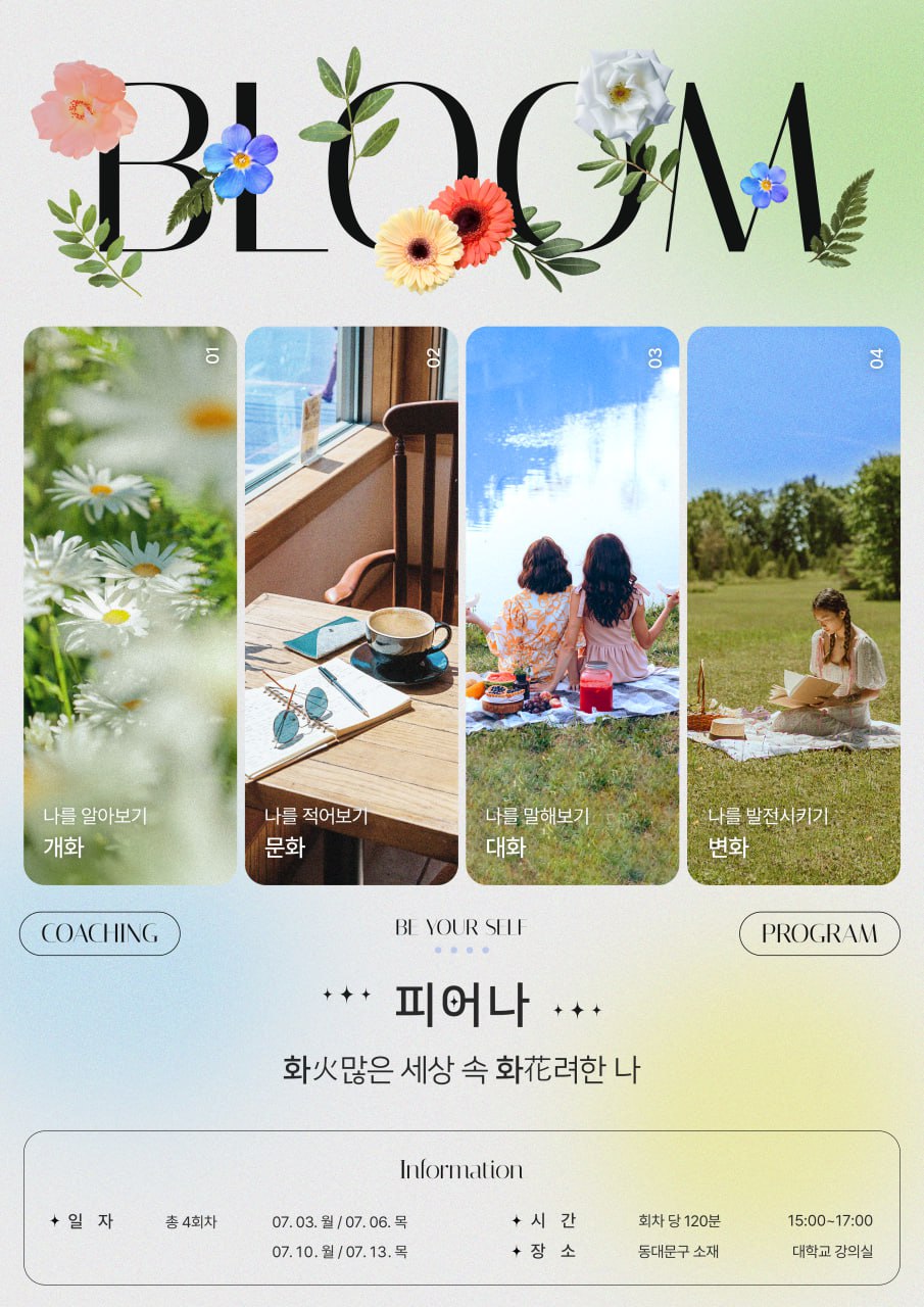 📌 커리큘럼 🌸1회차 (나를 알아보기 : 개화) : 나는 어떠한 꽃일까 ? 다른 사람에게도 내가 꽃으로 보일까 ?