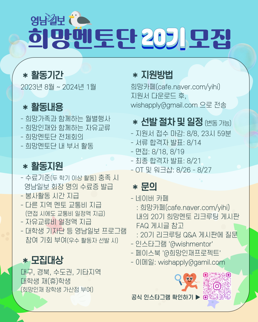 안녕하세요, 영남일보 주최 하에 지역 장학생 '희망인재'를 멘토링하는 희망멘토단입니다🥰 지역 내 장학생과 함께 정서/학습 교류를 통해 멘토링을 진행하며, 멘토단을 운영하기 위한 다양한 역할을 분배하여 활동을 진행 중입니다. 올해로 11주년에 다가가는 희망멘토단과 함께 장기적으로, 다양한 인연을 만날 수 있는 기회 함께해요😊 보다 구체적인 사항은 해당 게시글 작성자에게 댓글이나 카페, 공식 인스타그램을 이용해주시면 감사하겠습니다!