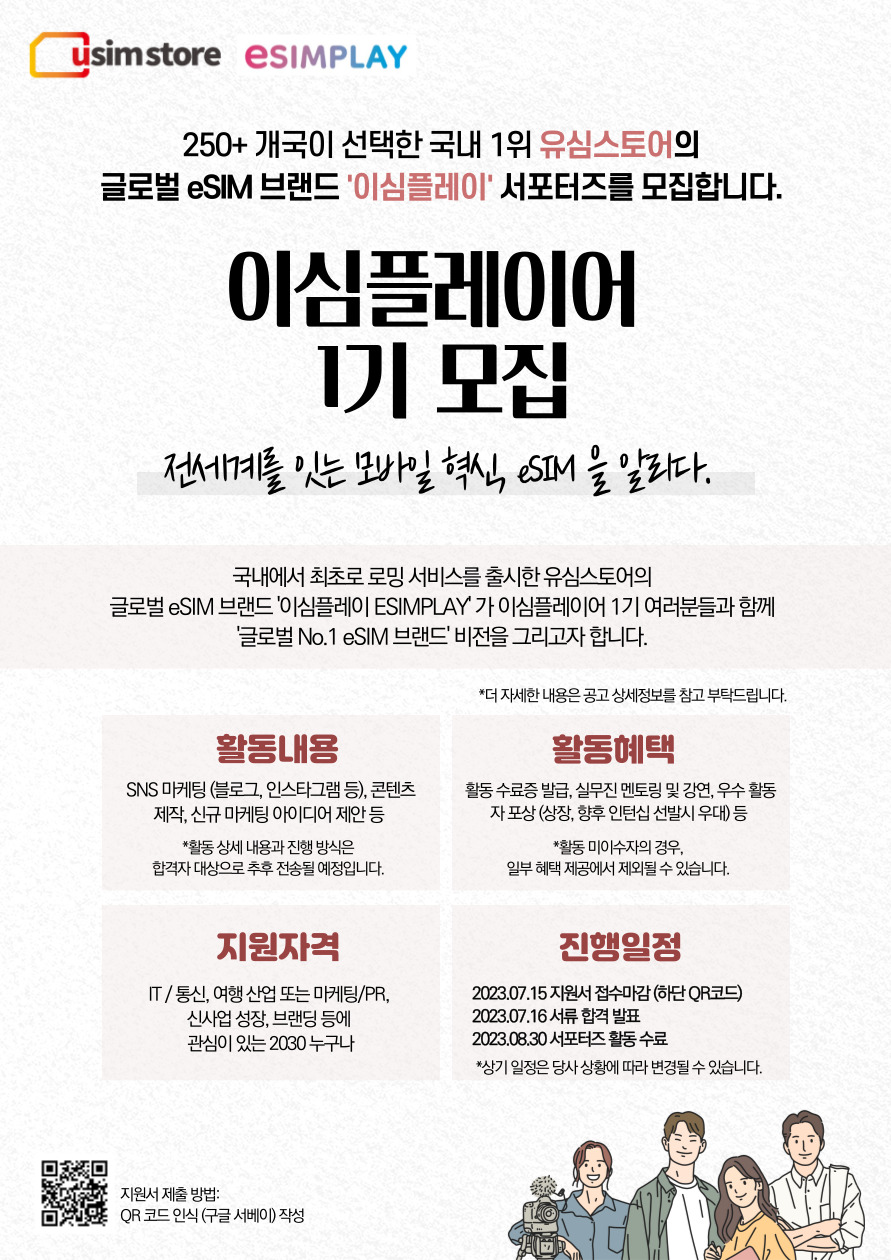 [진행일정] 2023.07.15 지원서 접수마감 (QR코드 촬영 또는 구글 서베이 링크로 접속) *지원서 접수 구글 서베이: [유심스토어] 서포터즈 ESIMPLAY 지원자 모집 - Google Forms 2023.07.16 서류 합격 발표 2023.08.30 서포터즈 활동 수료