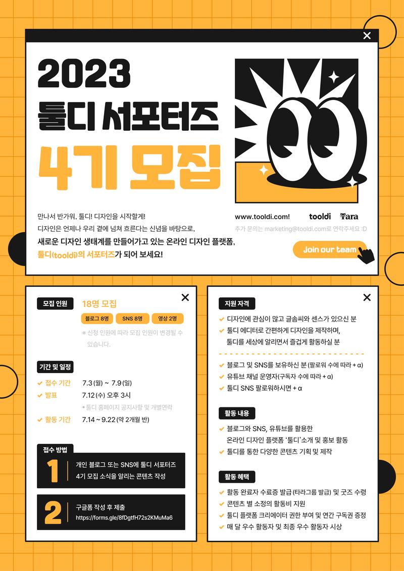 ■ 지원 자격 - 디자인에 관심이 많고 글솜씨와 센스가 있으신 분 - 툴디 에디터로 간편하게 디자인을 제작하여\, 툴디를 세상에 알리면서 즐겁게 활동하실 분 - 블로그 및 SNS를 보유하신 분 (팔로워 수에 따라 +α) - 유튜브 채널 운영자 (구독자 수에 따라 +α) - 툴디 SNS 팔로우하시면 +α