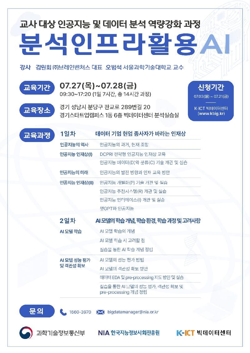 교육기간 : 07.27(목)\~07.28(금) 09:30\~17:20 (1일 7시간, 총 14시간 과정) 신청기간 : 07.03(월) \~ 07.21(금) K-ICT 빅데이터센터(www.kbig.kr)