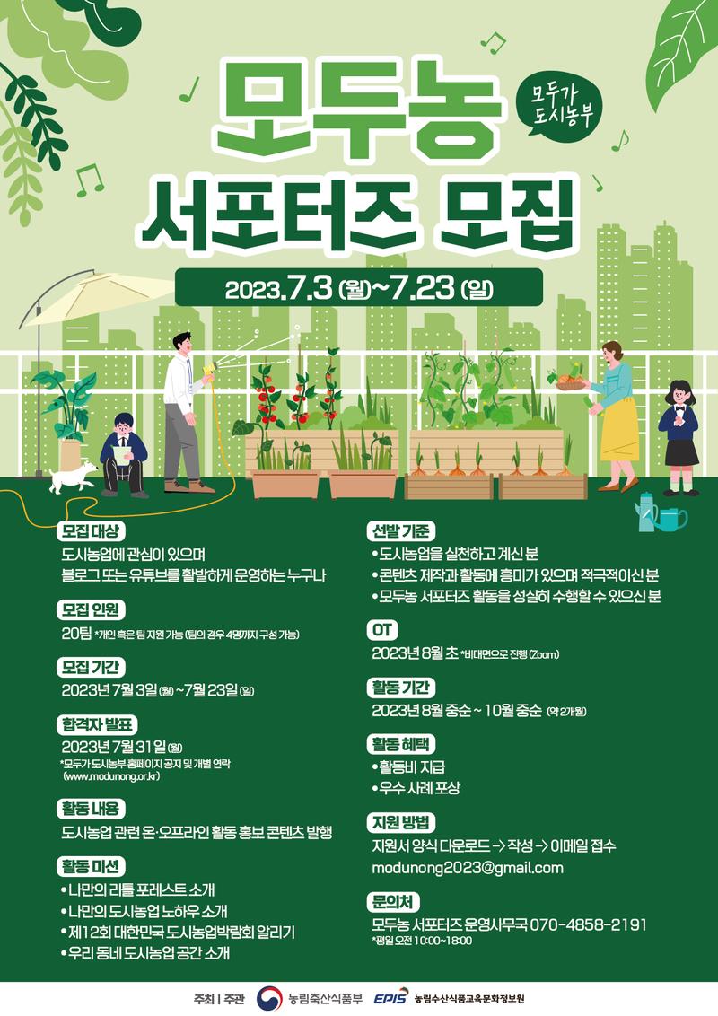 2023년 모두가 도시농부 서포터즈 모집 농림수산식품교육문화정보원과 함께 도시농업의 가치를 알릴 열정 가득한 모두농 서포터즈를 모집합니다!