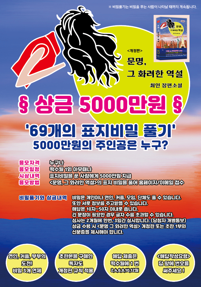 제27회 《문명 그 화려한 역설|개정판》 69개의 표지비밀 풀기 프로젝트 공모 ◈ 1억원고료 국제문학상 수상작품 《문명, 그 화려한 역설|개정판》 ◈ 개정판에서 쪽수를 과감히 줄였다. ◈ 초판본에서 제시한 220개 비밀을 대폭 줄여 표지에만 69개 배치했다. “재미있게 소설을 읽고 덤으로 비밀을 풀어 보세요!” * 비밀은 개인, 연인, 커플, 모임, 단체도 풀 수 있으며, 서로 정보를 교환할 수 있습니다. * 초판본을 구매한 독자도 개정판의 규칙을 적용해 비밀을 풀고 상금을 받을 수 있습니다. * 연인이나 커플, 부부가 도전할 경우 비밀 3개를 면제해 드립니다. * 비밀풀기는 비밀을 푸는 사람이 나올 때까지 계속됩니다. ■ 응모자격 개인, 연인, 커플, 모임, 단체 누구나 할 수 있습니다. ■ 응모방법 《문명, 그 화려한 역설》을 읽고 표지에 숨겨진 69개의 비밀을 풀어 홈페이지/이메일에 응모합니다. ■ 일정 비밀 풀기에 도전한 독자는 매 짝수월에 1회, 말일까지 도서출판 글여울 홈페이지/이메일에 해답을 제출할 수 있습니다. (2월, 4월, 6월, 8월, 10월, 12월 31일까지)