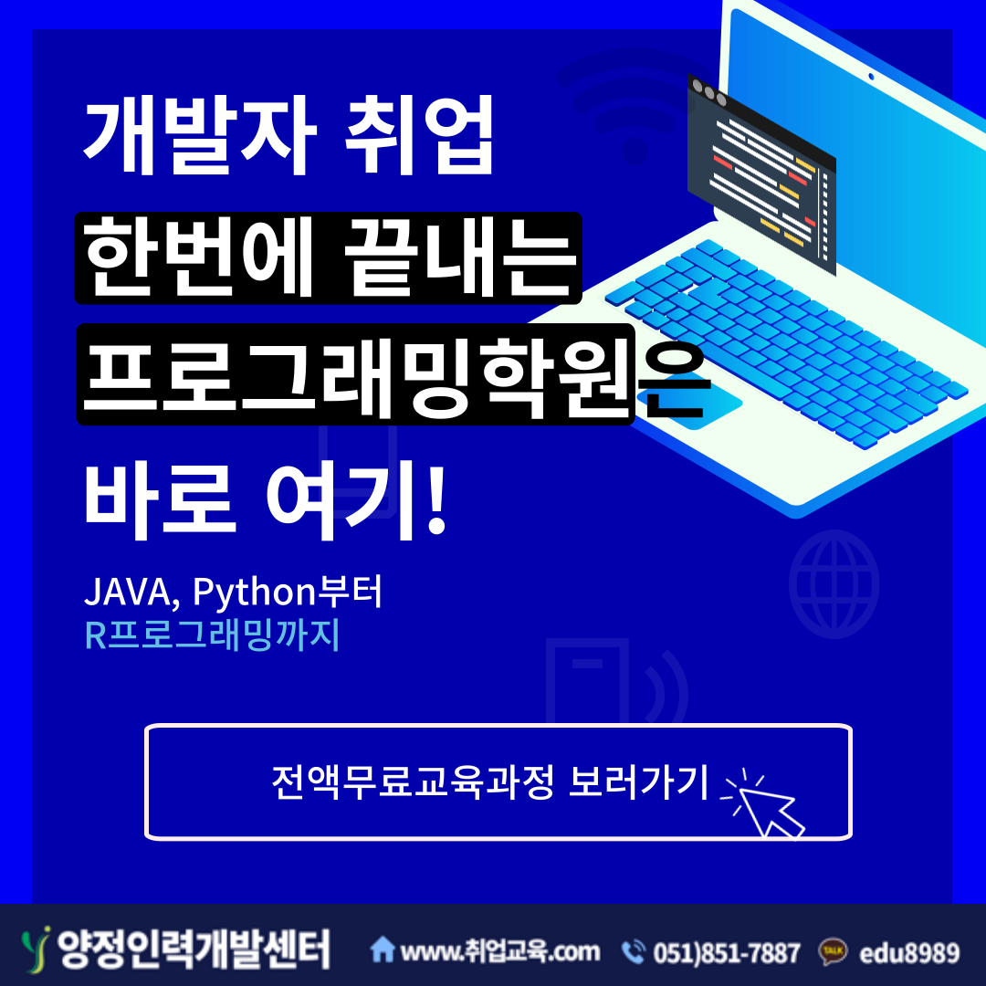 🖥️[개발자 취업교육반 모집 안내] 🔎교육명 : 빅데이터를 활용한 자바, 파이썬 개발자 📌교육일정 : 7월 12일\~12월 19일 ⌨️교육시간 : 월\~금 8교시(09:00\~17:30) ☑ 빅데이터 분석/통계에 관심있다면? ☑ 웹 개발 실무경험을 하고 싶다면? ☑ 맞춤형 기술 포트폴리오가 필요하다면? ☑ 개발자 취업 스펙 쌓고 싶다면? 📣모집대상 👌 국민내일배움카드 신청이 가능한 분 * 국비무료교육 참여 이력이 있어도 전액국비무료! 🧡 미취업 청년/졸업예정이신 분 * 부산&경남 거주 우대(부산에서 대면수업으로 진행!) ✏️ 해당 교육기간 동안 성실히 참여가능한 분 * 관련분야의 비전공자라도 참여 가능! 🎀 참여혜택 🌈실무 교육 전액 무료 👍교육수당 매월 최대 81만 6천원 지급 📚전 교재 무상제공 💻기업 실무 프로젝트 참여 💹개별 포트폴리오 제작 📜1대1 밀착 멘토링 📙1:1 전문가 취업컨설팅 🏆 높은 취업률 달성 🏅 취업률 우수직종선정 - 2019년 정보기술개발직종에 이어 2023년 문화콘텐츠제작직종 선정 수료생의 취업처 확인하러가기>> 🎖️수강생들의 높은 만족도** 수료생 취업성공인터뷰 보러가기>> 📌개발자 취업교육의 취업성공 커리큘럼!📌 ✔️빅데이터 처리분석 ✔️프로그래밍언어활용(JAVA, Python, jQuery, SQL등) ✔️프로그램관리/서버프로그램 구현 ✔️빅데이터기반 공공데이터 미니 프로젝트 ✔️빅데이터기반 웹서비스 플랫폼 개발 구현 프로젝트 등 💻개발자 취업교육 수료생의 포트폴리오 보러가기>> 🔊개발자 취업교육반에서 이런분들을 찾고 있어요!! 😀비전공자지만 IT취업을 준비하는 분 👍웹 개발 실무경험이 부족한 분 🧡취업용 포트폴리오가 필요한 분 💙개발자 취업 스펙을 쌓고 싶은 분 ❤️빅데이터 통계&분석을 활용하고 싶은 분 💚주요 프로그래밍 기술을 익히고 싶은 분 🏆양정인력개발센터의 강점!! 1) 초보자-비전공자도 충분히 따라갈 수 있는 수업 2) 개발자 취업에 필수인 프로젝트 연계 교육 3) 실무중심의 교육을 통한 빠른 현장 적응력 4) 1대1 취업지원서비스 제공(이력서 특강과 자소서 첨삭) [개발자 취업교육문의] 💬1:1 카톡 상담 링크 : https://open.kakao.com/o/sLeHXBQb ☎ 유선 상담 안내 051)851-7887 유선연락 또는 홈페이지 수강신청을 남겨주시면, 연락드리겠습니다. 유선 상담 예약하기(링크)