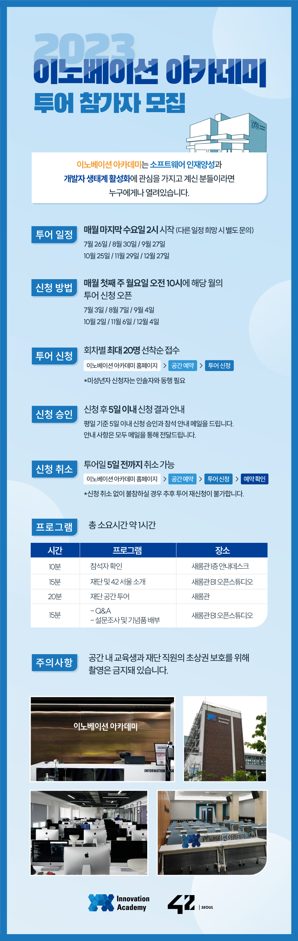⠀ 프로그램 [투어 코스] 총 소요시간 약 1시간 ⠀ 「시간」 프로그램 1) 「10분」 참석자 확인 2) 「15분」 재단 및 42 서울 소개 3) 「20분」 재단 공간 투어 4) 「15분」 Q&A와 설문조사 및 기념품 배부 ⠀ 투어 시 주의사항 ⠀ 공간 내 교육생과 재단 직원의 초상권 보호를 위해 촬영은 절대 금지 ⠀ 투어 신청 [회차별 최대 20명 선착순 접수] ⠀ 이노베이션 아카데미 홈페이지 → 공간 예약 → 투어 신청 * 미성년자 신청자는 인솔자와 동행 ⠀ 신청 승인 ⠀ 신청 후 5일 이내 신청 결과 안내 * 평일 기준 5일 이내 신청 승인과 참석 안내 메일 전송 * 안내 사항은 모두 메일을 통해 전달 ⠀ 신청 취소 ⠀ 이노베이션 아카데미 홈페이지 → 공간 예약 → 투어 신청 → 신청내역 확인하기 * 투어일 5일 전까지 취소 가능 * 신청 취소 없이 불참하실 경우 ㅤ추후 투어 재신청이 불가 ⠀ 투어 일정 ⠀ 7월 26일 / 8월 30일 / 9월 27일 / 10월 25일 / 11월 29일 / 12월 27일 * 매월 마지막 수요일 2시 시작 ㅤ(다른 일정 희망 시 별도 문의) ⠀ 신청 방법 ⠀ 7월 3일 / 8월 7일 / 9월 4일 / 10월 2일 / 11월 6일 / 12월 4일 * 매월 첫째 주 월요일 오전 10시에 ㅤ해당 월의 투어 신청 오픈 ⠀ 투어 참여하시는 여러분은 일정 사항을 반드시 확인해 주시길 바랍니다‼ ⠀ 이노베이션 아카데미 투어는 소프트웨어 인재 양성과 개발자 생태계 활성에 관심을 가지고 계신 누구나 참가 가능합니다.