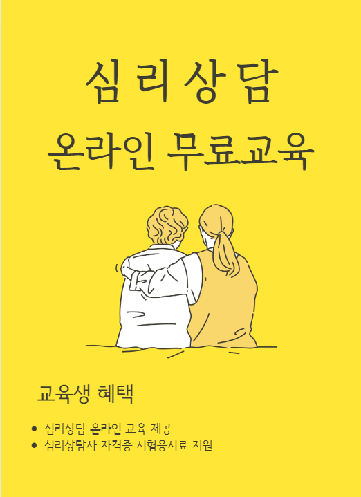 ● 요즘 뜨고 있는 심리 관련 공부를 해보고 싶다면? ● 심리상담, 단순한 교양수업이 아닌 자격증 발급이 가능! ● 비싼 심리상담 강의, 자격증 준비 전액 지원 받으며 해보고 싶다면?