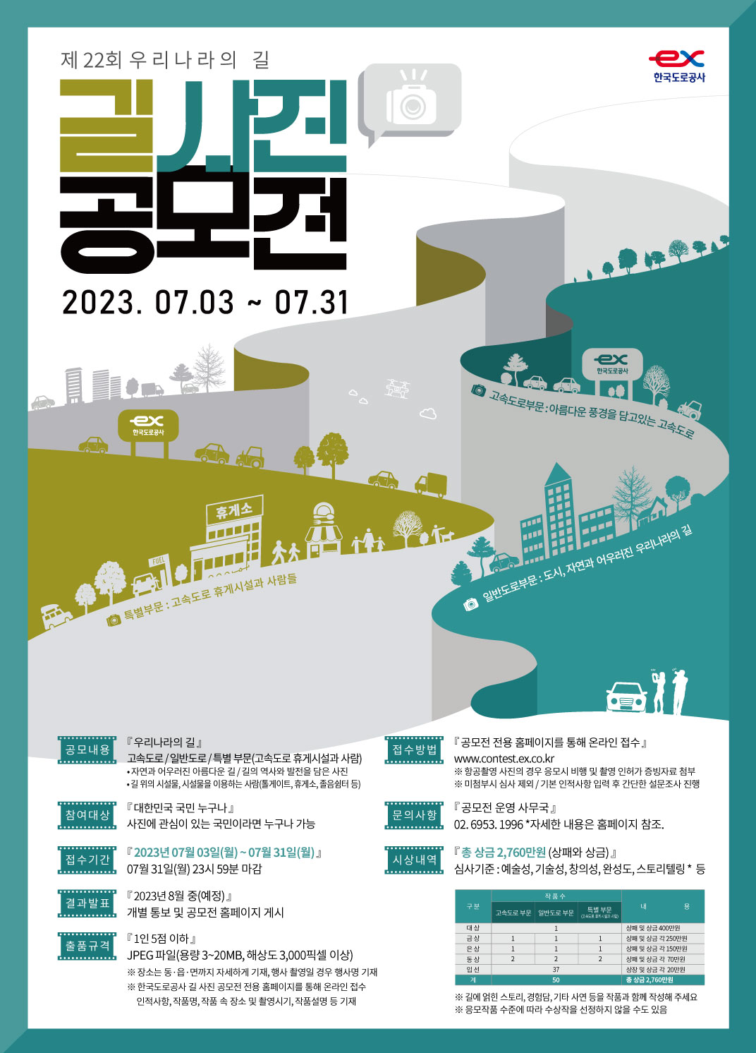 2023 제22회 길사진 공모전 ◈ 공모내용 *우리나라의 길 1.고속도로 2.일반도로 3.특별 부문(고속도로 휴게시설과 사람) - 자연과 어우러진 아름다운 길 - 길의 역사와 발전을 담은 사진 - 길 위의 시설물\, 시설물을 이용하는 사람(톨게이트\, 휴게소\, 졸음쉼터 등) ◈ 출품자격 : 대한민국 국민 누구나 ◈ 접수기간 : 2023년 7월 3일(월) \~ 7월 31일(월) ◈ 출품규격 : JPEG 파일(용량 3\~20MB, 해상도 3,000픽셀 이상) ◈ 출품요령 - 한국도로공사 길 사진 공모전 전용 홈페이지를 통해 온라인 접수 - 인적사항\, 작품명\, 작품 속 장소 및 촬영시기\, 작품설명 등 기재 - 설문조사 참여 ※ 장소는 동·읍·면까지 자세하게 기재, 행사 촬영일 경우 행사명 기재 ◈ 출품작수 : 1인 5점 이하 ◈ 결과발표 : 2023년 8월 중(예정), 개별 통보 및 공모전 홈페이지 게시 ◈ 시상내역(총 상금 2,760만원) - 대상 : 1명 / 상패 및 상금 400만원 - 금상 : 3명 / 상패 및 상금 250만원 - 은상 : 3명 / 상패 및 상금 150만원 - 동상 : 6명 / 상패 및 상금 70만원 - 입선 : 37명 / 상패 및 상금 20만원 ※ 응모작품 수준에 따라 수상작을 선정하지 않을 수도 있음 ◈ 접수방법 - 공모전 전용 홈페이지를 통해 온라인 접수 http://contest.ex.co.kr - 기본 인적사항 입력 후 간단한 설문조사 진행 ※ 항공촬영 사진의 경우 응모시 비행 및 촬영 인허가 증빙자료 첨부(미첨부시 심사 제외) ◈ 심사기준 - 주제 적합성\, 공모규정 준수 확인 - 합성\, 조작 등의 위변조 및 타 공모전 중복출품 불가 - 선명도 및 색감 등의 보정작업 가능\, 사진의 형태 또는 내용 등에 영향을 주는 작업 불가 - 공모전 홈페이지를 통해 10일간의 이의제기 기간 거쳐 검증 - 예술성\, 기술성\, 창의성\, 완성도\, 스토리텔링* 등 ※ 길에 얽힌 사연, 경험담, 이야기 등(2023년 신설) ◈ 문의사항 - 운영사무국 : 02-6953-1996 - 채널문의 : pf.kakao.com/_UtGIb/friend - 이메일 : abc@babkorea.com