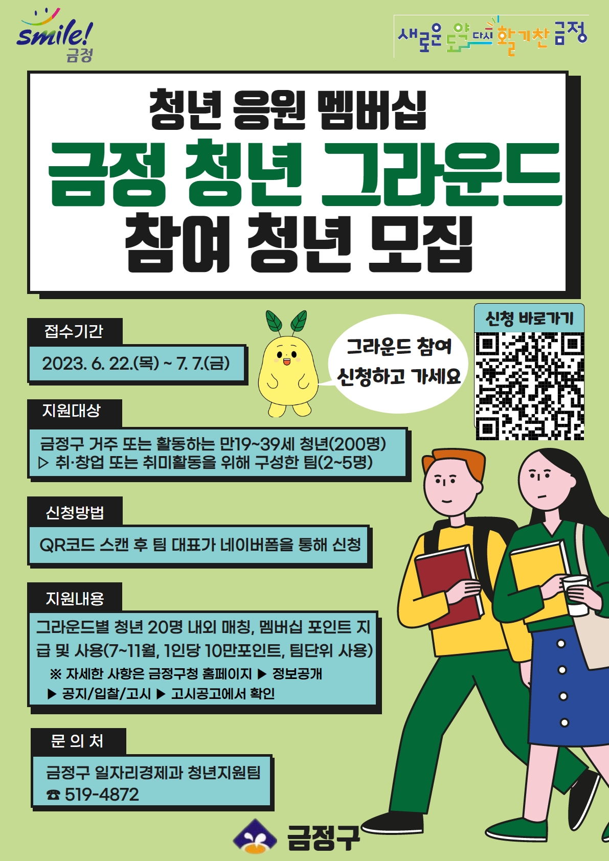 ○ 공고·접수 기간 : 2023. 6. 22.(목) \~ 7. 7.(금) 까지 ※ 접수 기간은 참여자 모집현황에 따라 변경될 수 있음 ○ 신청방법 : 팀 대표가 네이버폼 (https://naver.me/FBDPonRb) 으로 참여 신청 ○ 신청자격 : (공고일 기준)금정구 거주 또는 활동하는 만19\~39세 청년* ▷ 금정구에 주민등록을 둔 청년 ▷ 금정구 소재 대학에서 재학 또는 휴학중인 청년 ▷ 금정구 소재 단체·기관, 사업장 등에서 활동(근무)하는 청년 * 1983. 6. 23. \~ 2004. 6. 22. 출생자 ○ 지원대상 : 취·창업 또는 취미활동 등을 위해 구성한 팀(2\~5인) ▷ 동아리, 취미 또는 취업 준비 및 스터디, 예비창업자 등 ○ 지원내용 ▷오리엔테이션(7월) : 그라운드 이용방법 공지 등 ▷ 포인트 지급 및 사용(7월\~11월, 5개월간) - 지원금액 : 응원청년 1명당 10만원 상당의 모바일 포인트 배정 - 지급방법 : 모바일 앱을 사용하여 팀 단위 포인트 지급 - 사용방법 : 지정된 그라운드 방문 시 음료 구입\, 회의실 대여 등 차감 사용 ※ 팀별 매칭된 그라운드에서만 포인트 사용 가능 ▷ 활동보고서 제출(11월) : 참여후기, 활동결과 및 건의사항 등 작성 제출 ▷ 성과보고회 개최(12월) :사업성과 공유 및 우수활동팀 선정 ▷ 문의처 : 금정구 일자리경제과 청년지원팀(051-519-4872)