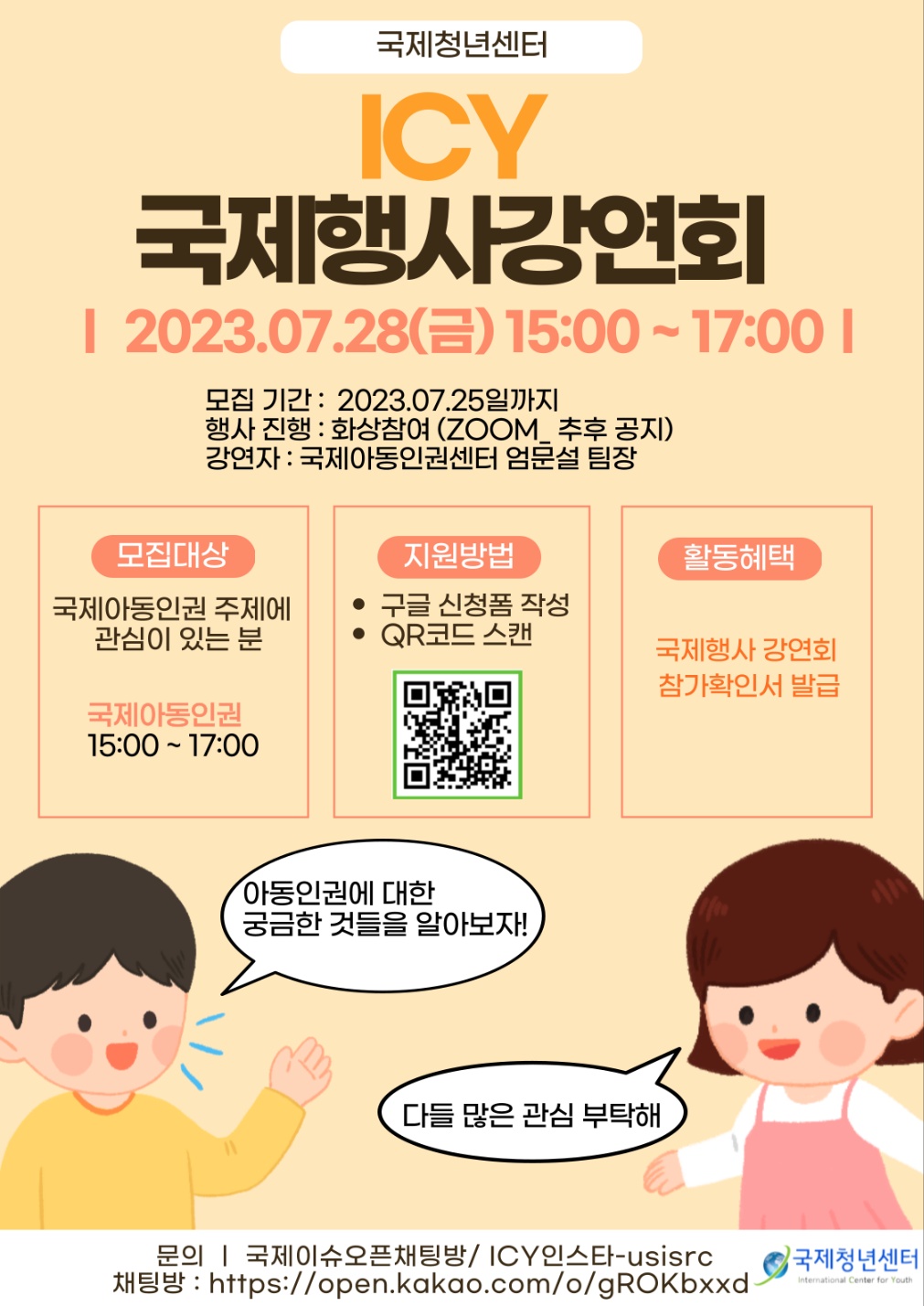 안녕하세요! 국제청년센터 국제행사팀입니다! 이번에 국제아동인권에 대한 주제를 가지고 강연회를 진행할 예정입니다! 평소에 국제아동인권에 대한 관심과 궁금증이 있으시다면 좋은 경험이 될 것이라고 장담합니다! 본 강연회는 국제아동인권센터의 강연자님과 함께할 예정입니다 강연회를 통해 주제에 대한 더 많은 내용을 설명 및 공유하고 여러분들의 궁금증을 풀어드리겠습니다! 많은 참여 부탁드리겠습니다! - 모집대상: 아동인권에 대해 관심있으신 모두:) - 강연회 참여자 모집기간: 공고문 업로드후 7월 25일까지 - 강연회 일시: 7월 28일(금) 15:00-17:00 - 강연회 장소: 온라인 줌회의 (국내외의 참여자들의 원활한 참석을 위해 온라인으로 진행) - 지원방법: 공고글 및 링크 혹은 큐알코드 스캔후 구글폼 작성 https://forms.gle/AVVkKTCubAEeXupL6 - 활동혜택: 국제행사 강연회 참가확인서 발급 문의사항: 카카오톡 오픈채팅방 https://open.kakao.com/o/gROKbxxd