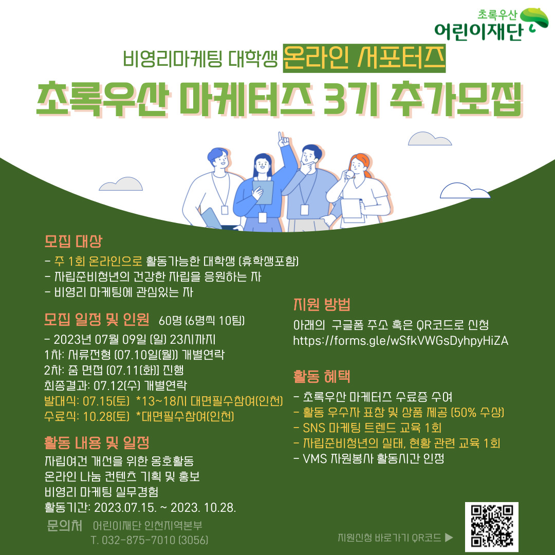 [초록우산어린이재단] 초록우산마케터즈3기 모집 (\~7/9) 안녕하세요! 초록우산어린이재단 인천지역본부에서는 “초록우산 마케터즈 3기”를 모집하고 있습니다. 많은 관심 부탁드립니다. *기간 및 일정 - 서류전형 : \~2023.07.09(일) (23:00 제출 마감) - 서류결과 : 2023.07.10.(월) 개별연락 - 줌 면 접 : 2023.07.11.(화) - 최종결과 : 2023.07.12.(수) 개별연락 - 발 대 식 : 2023.07.15.(토) 13:00\~18:00분 예정 (*대면필수참여_인천) - 수 료 식 : 2023.10.28. (토) (*대면필수참여_인천) - 활동기간 : 2023.07.15(토)\~2023.10.28(토) *모집대상 - 주 1회 인천지역내 활동 가능한 대학생 (휴학생 포함) - 자립준비청년의 건강한 자립을 응원하는 분 - 비영리 마케팅에 관심이 있으신 분 *접수방법 https://forms.gle/B29EmxVVRwwGhSR97 *활동내용 - 지립여건 개선을 위한 옹호활동 - 온라인 나눔 컨텐츠 기획 및 홍보 - 비영리 마케팅 실무경험 *활동혜택 - 초록우산 마케터즈 활동 수료증 수여 - 활동 우수자 표창 및 상품제공 (활동팀 50% 수상) - SNS 마케팅의 트렌드 교육 1회 제공 - 자립준비청년의 실태 및 현황, 실제 성장 사례 등 자립관련 교육 1회 - VMS 자원봉사 활동시간 인정