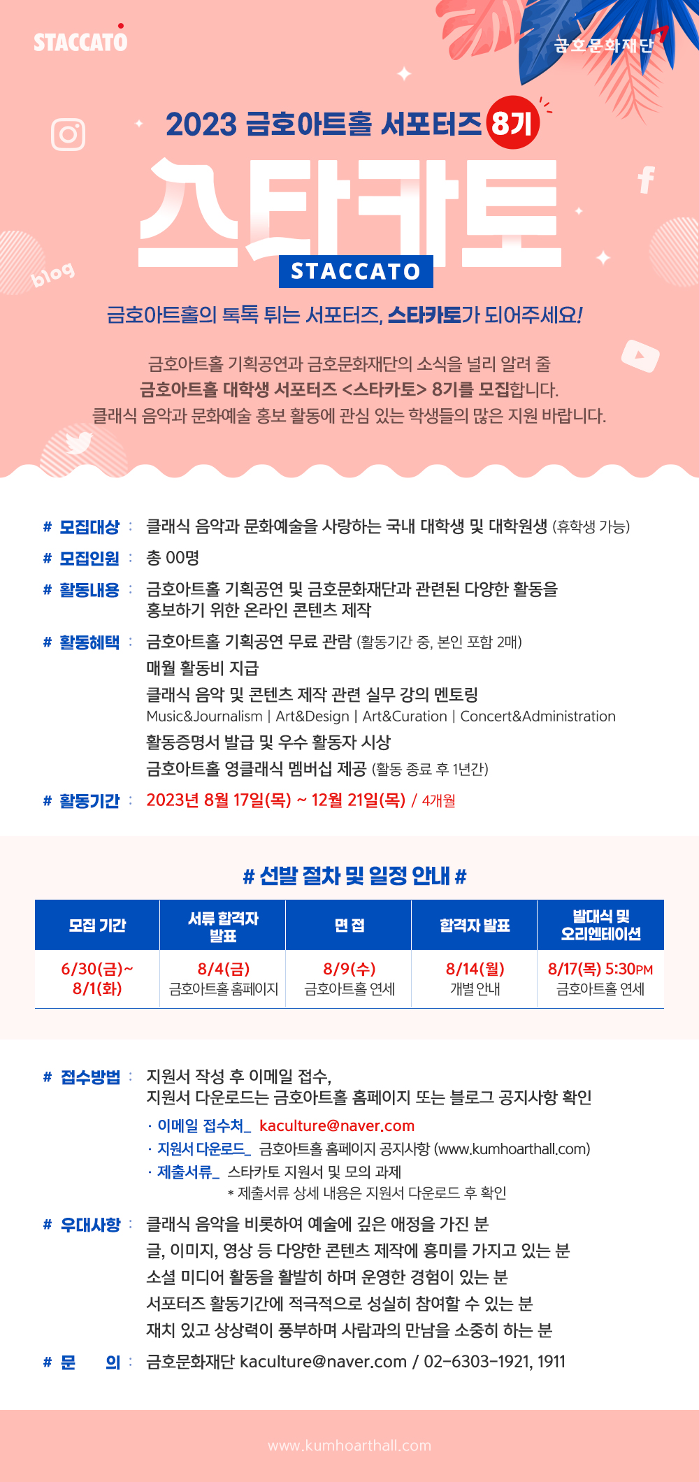 [금호문화재단] 금호아트홀 서포터즈 <스타카토> 8기 모집! (\~ 8/1)