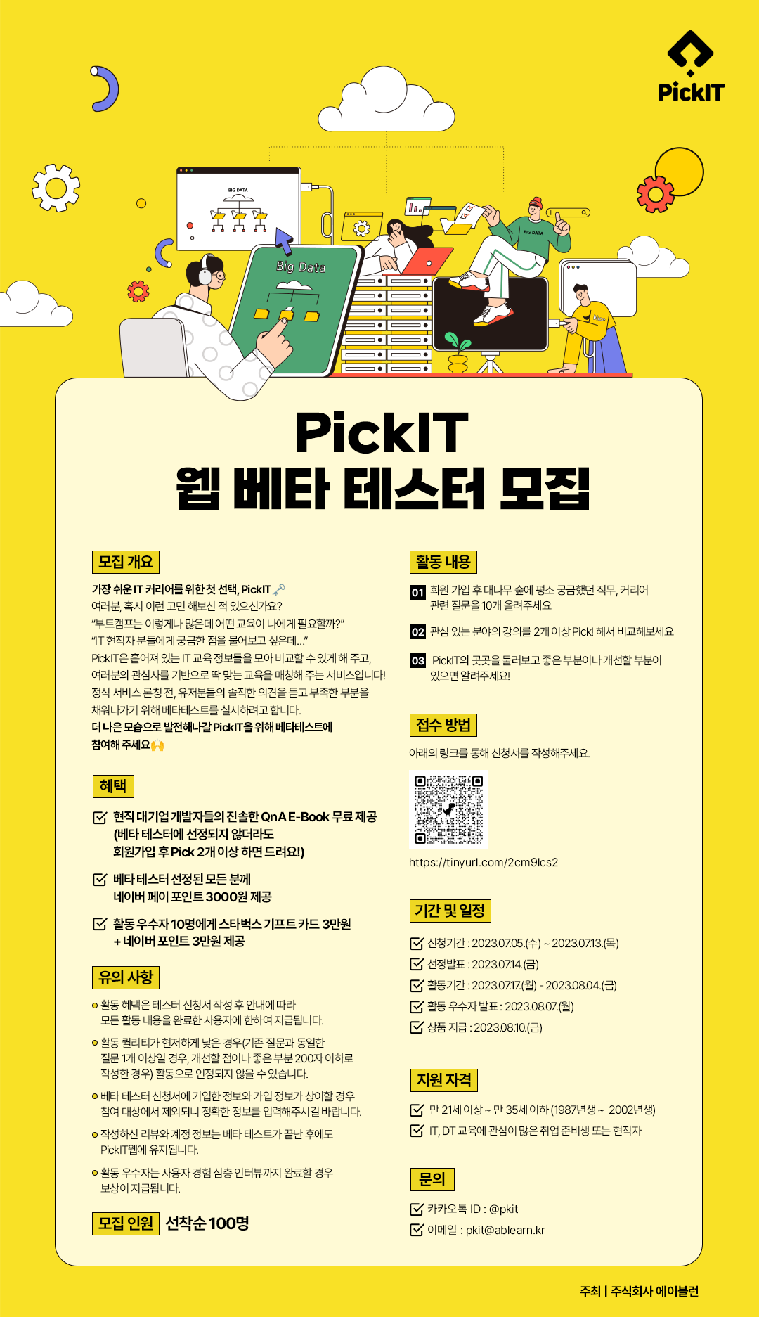 모집 개요 가장 쉬운 IT 커리어를 위한 첫 선택, PickIT🗝️ 여러분, 혹시 이런 고민 해보신 적 있으신가요? “부트캠프는 이렇게나 많은데 어떤 교육이 나에게 필요할까?” “IT 현직자 분들에게 궁금한 점을 물어보고 싶은데…” PickIT은 흩어져 있는 IT 교육 정보들을 모아 비교할 수 있게 해 주고, 여러분의 관심사를 기반으로 딱 맞는 교육을 매칭해주는 서비스입니다! 여러분의 솔직한 의견을 바탕으로 부족한 부분을 채워나가기 위해 베타테스트를 실시합니다. 더 나은 모습으로 발전해나갈 PickIT을 위해 베타 테스트에 참여해 주세요🙌 기간 및 일정 ✔ 신청기간: 2023.07.05.(수) \~ 2023.07.13.(목) ✔ 선정발표: 2023.07.14.(금) ✔ 활동기간 : 2023.07.17.(월) - 2023.08.04.(금) ✔ 활동 우수자 발표 : 2023.08.07.(월) ✔ 상품 지급 : 2023.08.10.(금) *자세한 일정과 활동 내용은 신청 시 입력한 이메일과 휴대폰으로 개별 안내