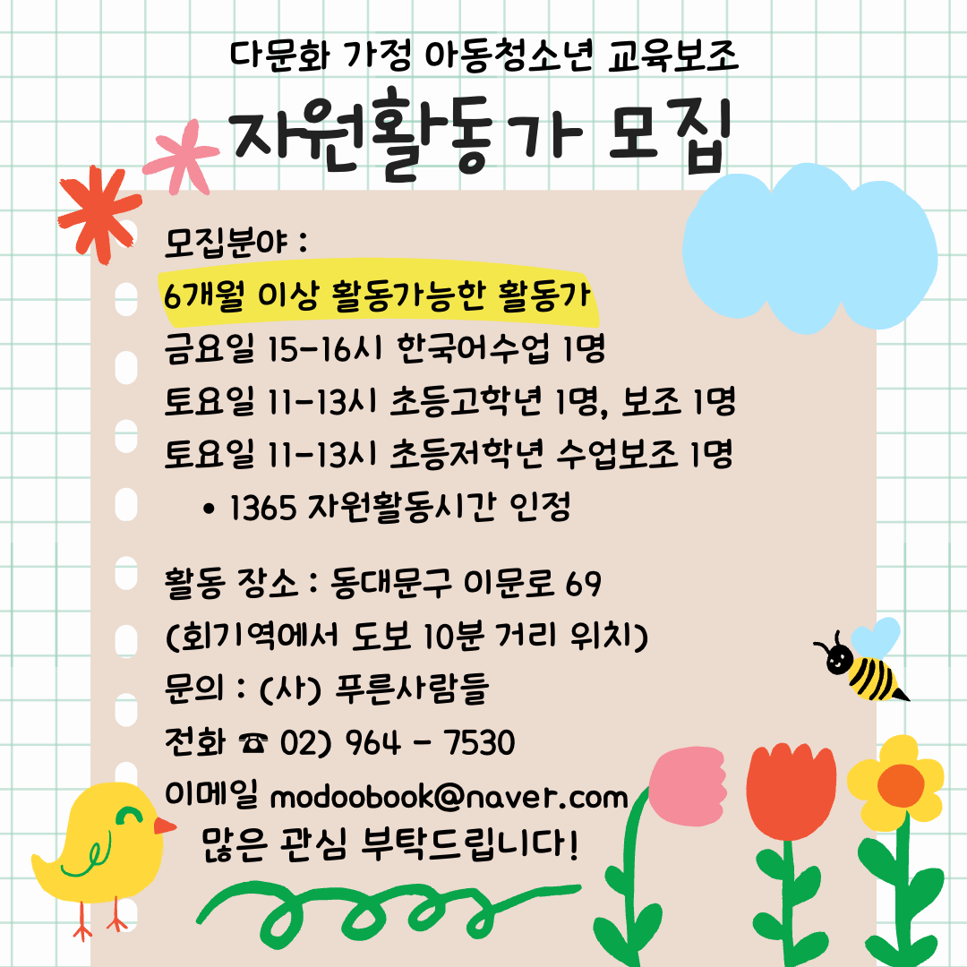✨다문화센터 모두 자원활동 교사 모집✨ ● 참가 자격 및 응모 대상 전공무관, 경력 무관, 영어실력 무관 배움과 나눔으로 행복을 느끼고 싶으신 분 다문화가정 어린이, 청소년과 함께하는 다양한 활동으로 기쁨을 나누실 분 밝고 긍정적인 마음으로 함께하실 분 6개월 이상의 꾸준하고 지속적인 참여가 가능하신 분 ● 활동 내용 다문화가정/중도입국가정 아동, 청소년들과 함께하는 한글 수업 및 학습지도 ● 활동 혜택(특전) - 1365 봉사시간 인정 ● 모집 일정 - 2023.7.05 \~ 모집 시까지 ● 접수 연락처 / 문의사항 전화 02-964-7530 이메일 modoobook@naver.com 위의 방법으로 연락주세요 :)