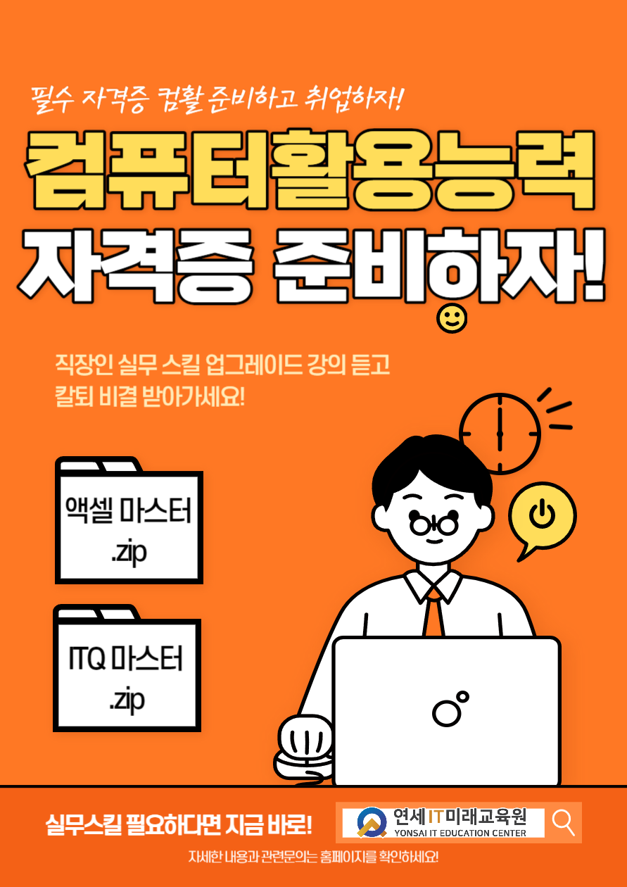 1) 기업의 인사고과 시, 가산점이 될 수 있는 컴퓨터 활용능력 자격증에 대하여 배움으로써, 스프레드시트 프로그램을 효과적으로 활용할 수 있는 전문 사무인력 능력을 습득하게 됩니다.