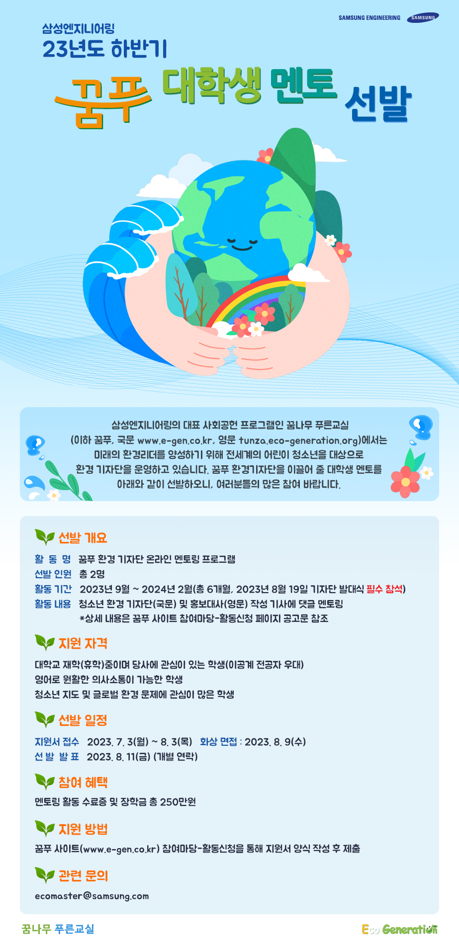 삼성엔지니어링의 대표 사회공헌 프로그램인 꿈나무 푸른교실 (이하 ‘꿈푸, 국문 www.e-gen.co.kr, 영문 tunza.eco-generation.org)에서는 미래의 환경리더를 양성하기 위해 전세계의 어린이 청소년을 대상으로 환경 기자단을 운영하고 있습니다. 꿈푸 환경기자단을 이끌어 줄 대학생 멘토를 아래와 같이 선발하오니, 여러분들의 많은 참여 바랍니다.