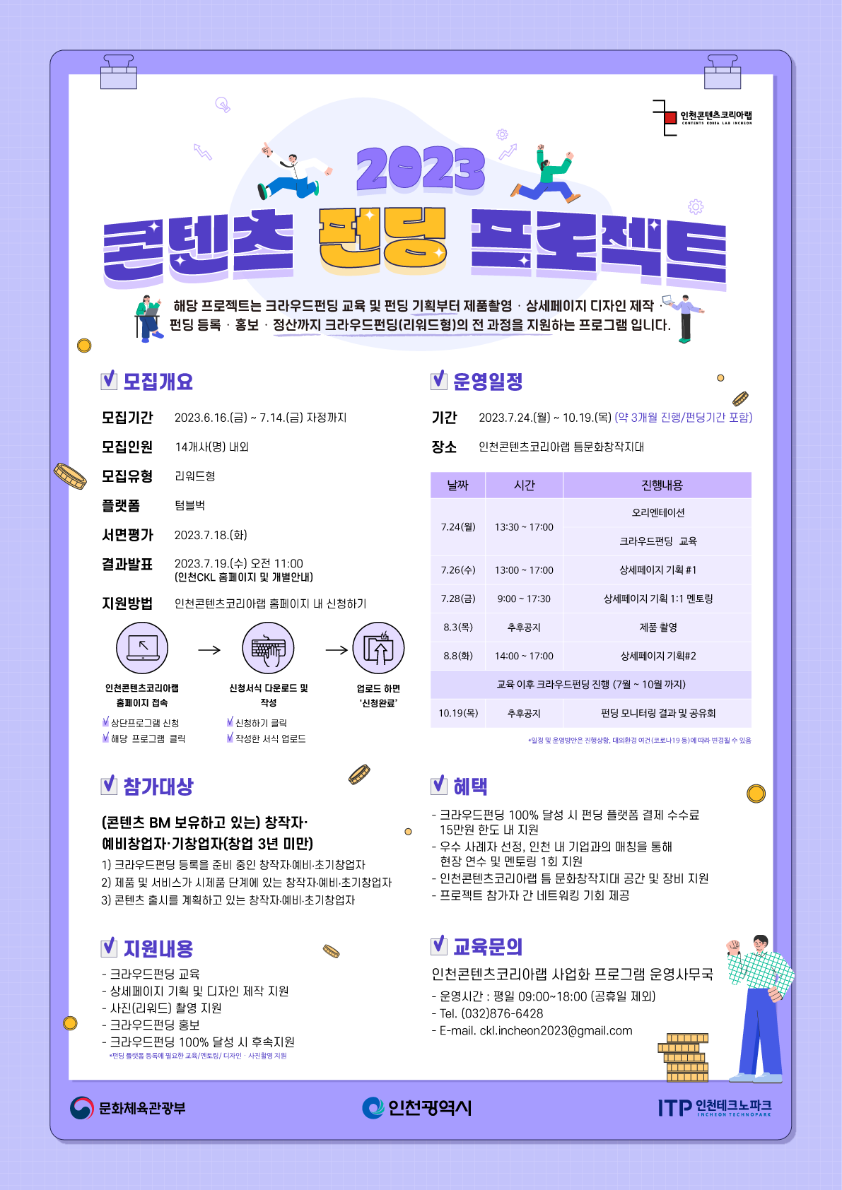 ▶ 모집기간 : 2023. 06. 16. (금) \~ 07. 14. (금) 자정까지 ▶ 모집대상 : 콘텐츠 BM을 보유하고 있는 창작자 · 예비창업자 · 기창업자(창업 3년 미만) ▶ 운영일정 : 2023. 07. 24. (월) \~ 10. 19. (목) (약 3개월 진행/펀딩기간 포함) ▶ 운영장소 : 인천콘텐츠코리아랩 틈문화창작지대 ▶ 신청하기 : 인천콘텐츠코리아랩 홈페이지 내 프로그램 신청 > '콘텐츠 펀딩 프로젝트' 클릭 > 신청서식 다운로드 및 작성 > 업로드 하면 '신청완료'