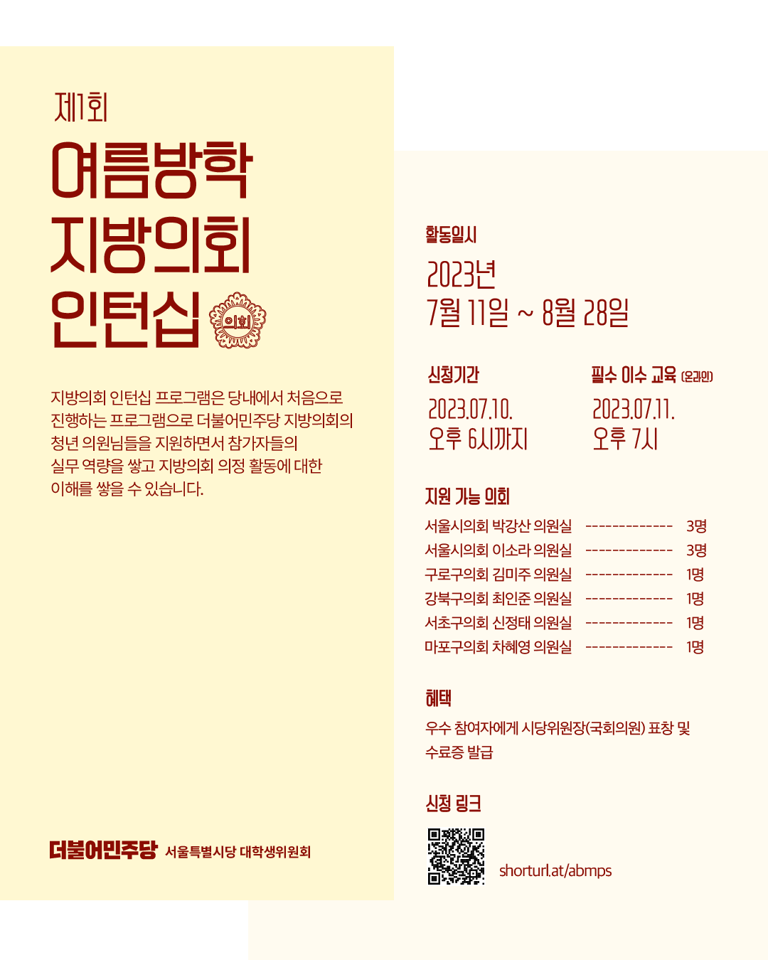 - 활동일시 : 2023년 07월 11일 \~ 2023년 08월 28일 - 지원가능 의회: 서울시의회 박강산 의원실 3명 서울시의회 이소라 의원실 3명 구로구의회 김미주 의원실 1명 강북구의회 최인준 의원실 1명 서초구의회 신정태 의원실 1명 마포구의회 차혜영 의원실 1명 - 혜택: 우수 참여자에게 시당위원장(국회의원) 표창 수료증 발급 - 신청기간: 2023.07.10 오후 6시까지 - 필수 이수 교육 2023.07.11 오후 7시 온라인 예정 - 필수 이수 요건 주 1회 이상, 총 6번 출근. 최소 3시간 이상 업무 (자세한 근무 시간은 의원실과 조율 예정) -신청: https://forms.gle/rZWqS276DYuVQu4c6
