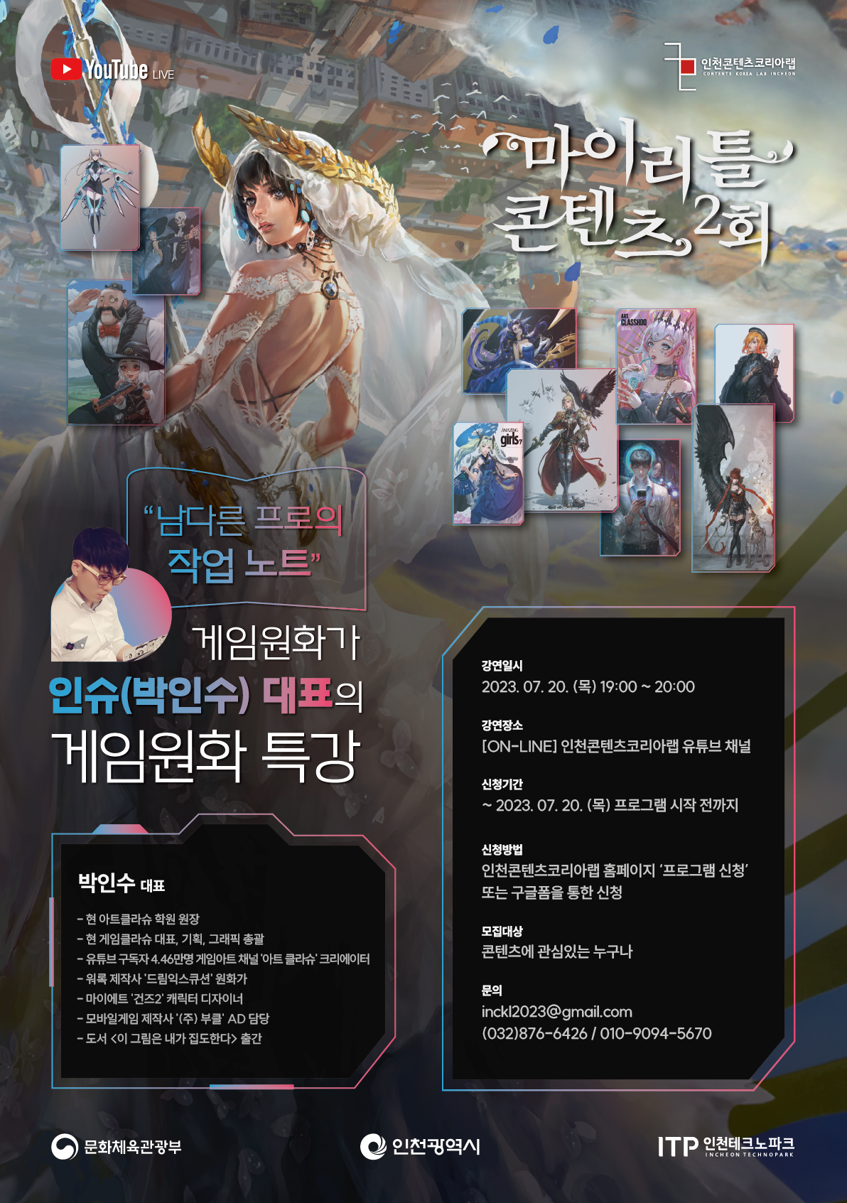 ▶ 일시: 2023. 07. 20. (목), 19:00 \~ 20:00 (약 1시간 예정) ▶ 장소: [ON-LINE] 인천콘텐츠코리아랩 유튜브 채널 라이브 스트리밍 ▶ 신청: 인천콘텐츠코리아랩 홈페이지 ‘프로그램 신청’(https://zrr.kr/Pplj) 또는 구글 폼을 통한 신청(https://forms.gle/CwsYtB9gs1b7EHJM9) ▶ 문의: 032) 876-6426 / inckl2023@gmail.com (인천콘텐츠코리아랩 운영사무국)