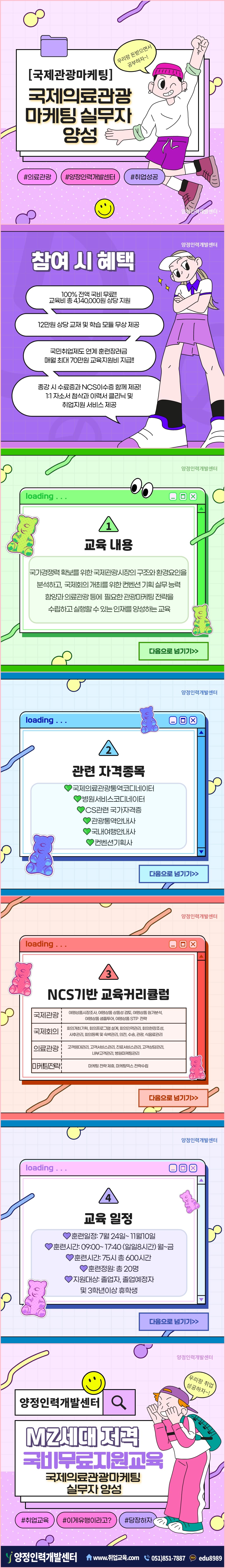 상세내용 ☑ 관광분야 취업에 관심있다면? ☑ MICE/컨벤션 실무경험을 하고 싶다면? ☑ 취업필수 포트폴리오가 필요하다면? ☑ MICE/컨벤션/광광분야 취업 스펙 쌓고 싶다면? 💡[2023 MICE, 관광마케팅, 의료관광 취업교육생 모집안내]💡 🌸교육명 : 국제의료관광마케팅 실무자 양성 🌸교육기간 : 7월 24일\~11월 10일(평일 8교시) 🌸교육장소 : (부산)양정인력개발센터_오프라인 교육 지하철 1호선 양정역 2번 출구 150m지점 ▶"2023 MICE, 관광마케팅, 의료관광 취업교육" 알아보기!➰ 📣단 3개월 만에 관광전문가로 취.뽀.가.능➰ ✔️교육비 0원! 100% 무료과정! ✔️MICE/컨벤션/관광마케팅 등 실무 위주 교육 제공! ✔️프토폴리오 피드백부터 취업 컨설팅까지 모두 받아보세요! ⭐교육참여 시 첫 번째 혜택🔎 😀 전액국비무료 : 100% 전액 국비지원(교육비 총 4,140,000원 상당) 😀 교재 제공 : 12만원 상당 무상지원 ⭐교육참여 시 두 번째 혜택🔎 😀 교육장려금 지급 : 매월 최대 700,000원 😀 교육장려금 지급대상자 ✔ 만 18세 이상 취업준비생 ✔ 대학졸업자 및 졸업예정자 ✔ 대학휴학생 및 재학생(3학년 이상) ⭐교육참여 시 세 번째 혜택🔎 ✔ 종강시 수료증과 NCS 이수증 함께 제공! ✔ 1:1 취업지원서비스 제공(이력서클리닉, 자소서첨삭 등) 👉 수강생의 취업성공 인터뷰 보러가기> 🙆이런분들 에게 추천합니다!!😃 👌 국민내일배움카드 신청가능자 -국민내일배움카드 발급대상자라면 전액국비지원! 👌 미취업상태의 취업 준비생 -관련분야의 전공자가 아니더라도 참여 가능합니다. 👌 수업시간에 성실히 참여할 수 있는 대학생 -재학생일 경우:4학년 졸업예정자 또는 기졸업자 -휴학생일 경우: 3학년 이상일 경우 참여 가능함. 👌 교육기간 동안 성실히 참여 가능한 분 -부산에서 진행하는 대면 교육인 점 참조 부탁 드립니다. 💙 2023 MICE, 관광마케팅, 의료관광 취업교육 커리큘럼
