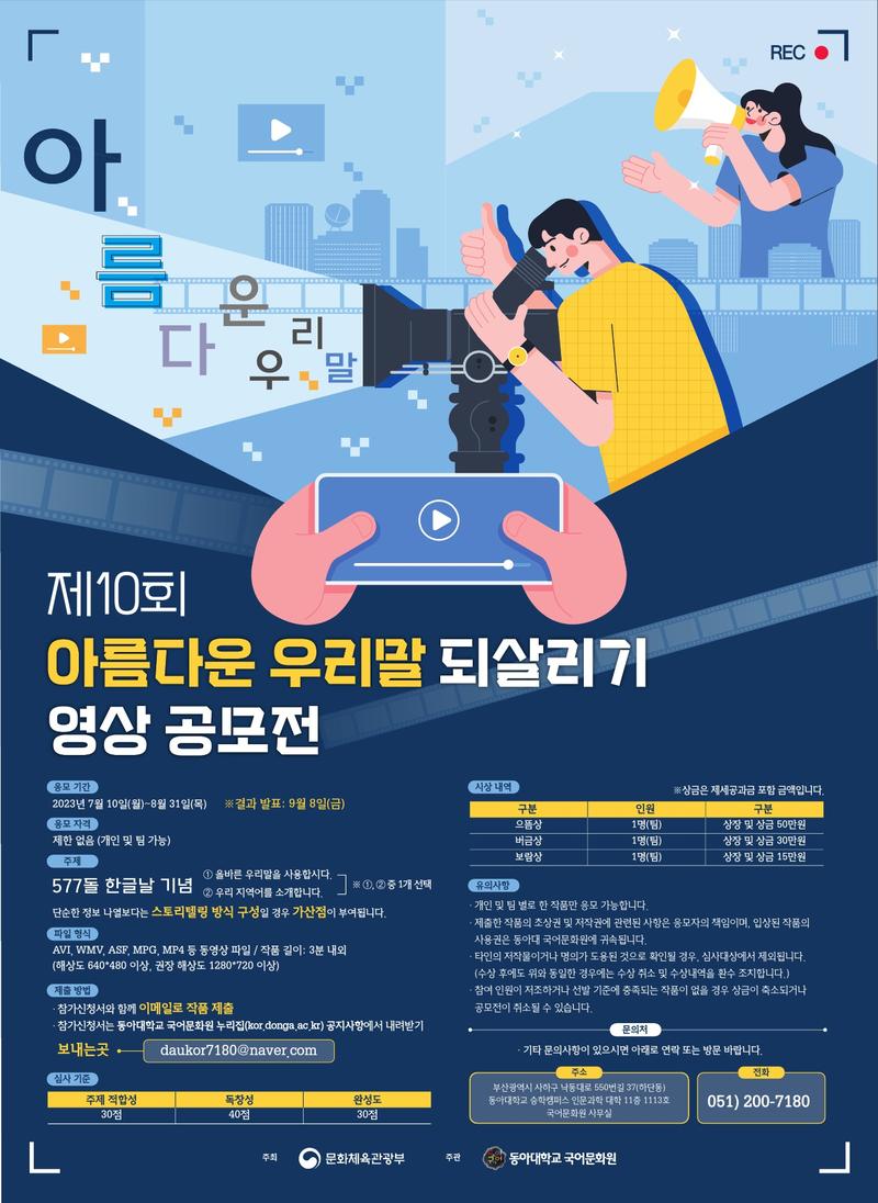 <제10회 아름다운 우리말 되살리기 영상 공모전> 1. 응모 기간: 2023년 7월 10일(월)\~8월 31일(목) [결과 발표: 9월 8일(금)] 2. 응모 자격: 제한 없음(개인 및 팀 가능) 3. 주제: 577돌 한글날 기념 ① 올바른 우리말을 사용합시다. ② 우리 지역어를 소개합니다. [※ ①, ② 중 1개 선택] 단순한 정보 나열보다는 스토리텔링 방식 구성일 경우 가산점이 부여됩니다. 4. 파일 형식 ∙AVI, WMV, ASF, MPG, MP4 등 동영상 파일 (해상도 640*480 이상, 권장 해상도 1280*720 이상) ∙작품 길이: 3분 내외 5. 제출 방법: 참가신청서와 함께 이메일로 작품 제출 ∙참가신청서는 동아대학교 국어문화원 누리집(kor.donga.ac.kr) 공지사항에서 내려받기 ∙보내실 곳: daukor7180@naver.com 6. 심사 기준