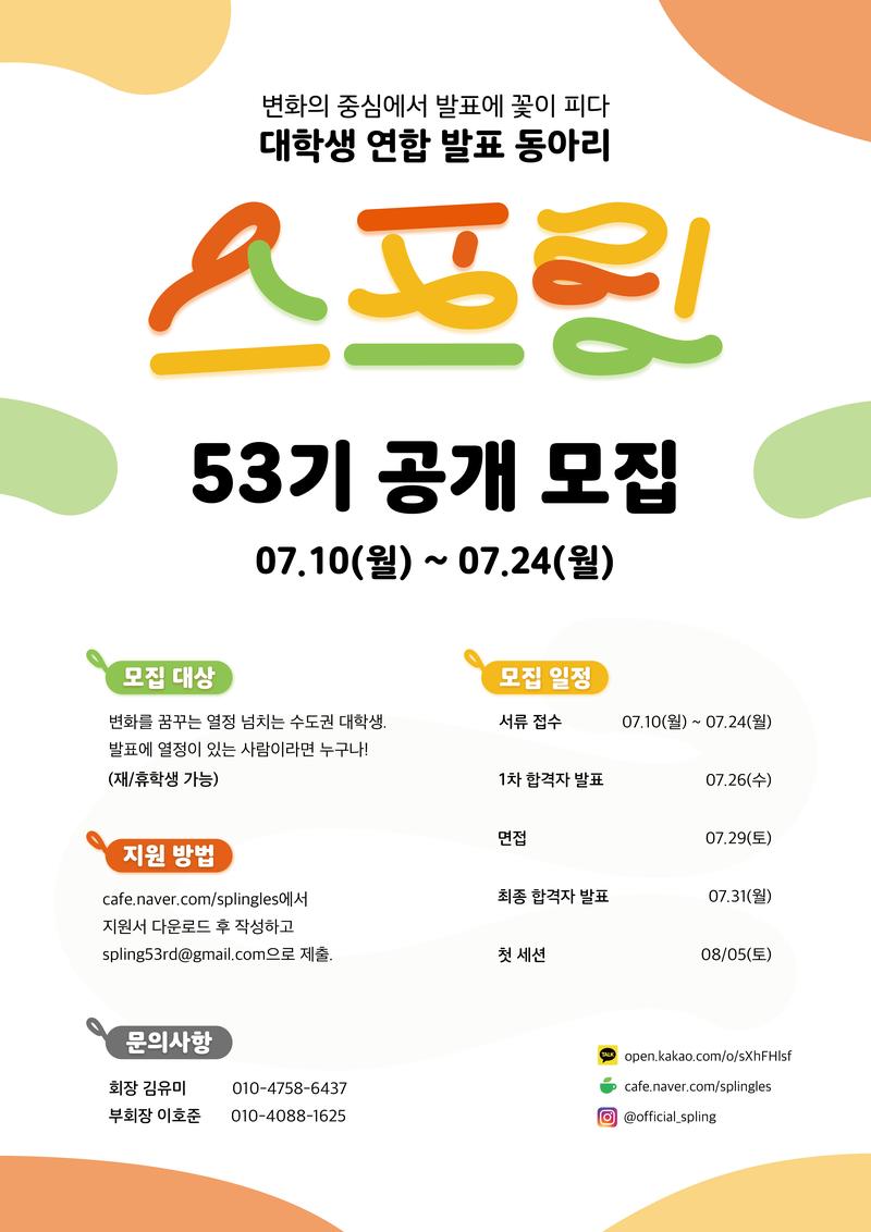 <지원방법> 1. 스프링 카페(https://cafe.naver.com/splingles)의 [스프링 공개모집] 게시판에서 지원서를 다운받는다. 2. 지원서를 작성한 후 spling53rd@gmail.com으로 2023년 7월 24일(월) 23:59까지 보낸다.