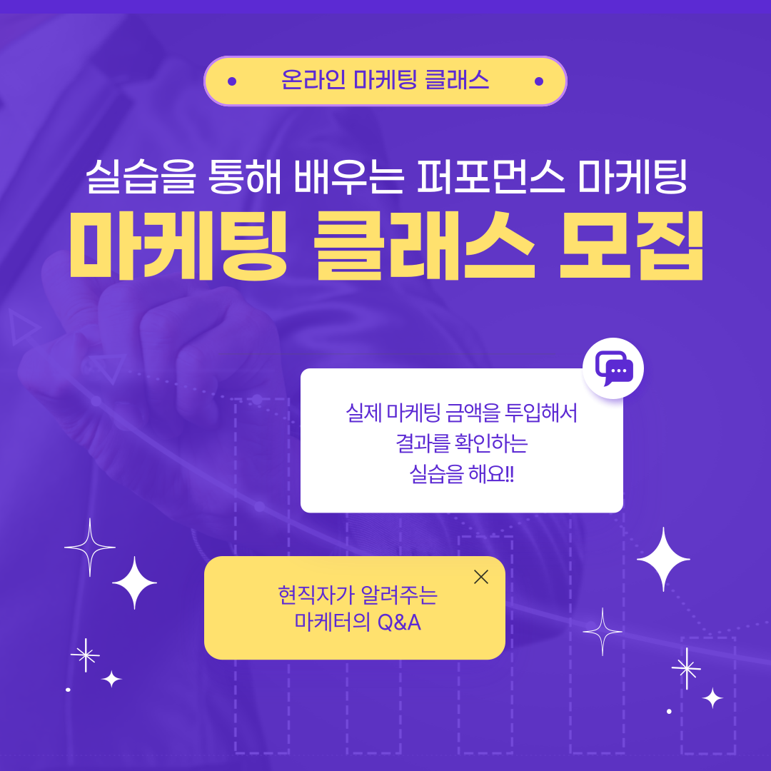마케터가 되고 싶으신가요? 가장 Hot 한 퍼포먼스 마케터는 어떠신가요. ● 이런 분들께 도움이 되요! 1) 마케터 취업을 희망하시는 분 2) 마케팅 실습이 필요하신 분 3) 마케터 진로에 대해 이해가 필요한 분 ● 강의 안내 1) 모집기간 : 7월 14일까지 모집합니다. 2) 진행요일 및 시간 - 매주 토요일 오전 10:00\~12:00 (2시간) - 총 4회 진행 (총 8시간 강의) 3) 강의 진행 - 온라인 실시간 강의로 진행됩니다. - 마케팅에 대한 이론과 실습으로 구성되어 있습니다. 1주차 : 마케팅 기획, 직무의 이해 2주차 : 페이스북/인스타 마케팅(실습) 3주차 : 마케팅성과 분석 및 A/B Testing (실습) 4주차 : Full Funnel 마케팅의 이해 ● 신청링크 및 상세정보 https://forms.gle/qcWwuKC8NpPrJn4u5 ● 퍼포먼스 마케팅 클래스만의 특징!! 1) 실제 마케팅비를 사용하여 결과를 도출하실 수 있습니다 (마케팅비 지원) 2) 실시간 온라인 강의로 지역에 상관없이 진행 가능합니다. 3) 각자 개인의 프로젝트에 적용될 수 있는 실질적인 커리큘럼입니다. 4) 매출상승 700%의 노하우를 배웁니다. 5) 수료증을 제공해드립니다. ● 문의 1) 홈페이지 : https://no1pmedu.oopy.io/ 2) 카카오톡 : https://open.kakao.com/me/Creatorsong