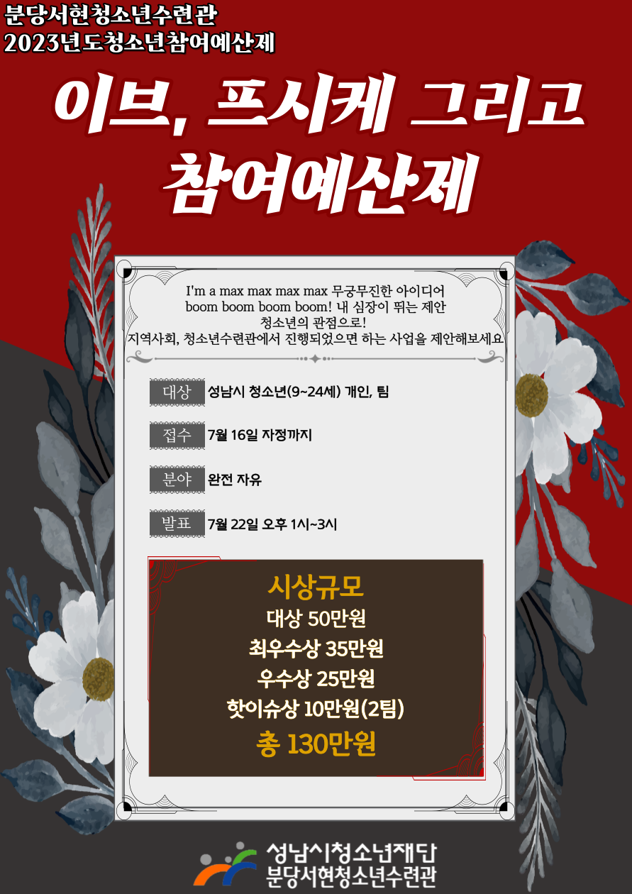I'm a max max max max 무궁무진한 아이디어로, boom boom boom boom! 내 심장이 뛰는 제안으로, 청소년들의 심장이 뛰는 사업을 제안해주세요! 내가 낸 제안이 수련관에서 직접 쓰일 수 있는 기회! 당선 상금은 무려 50만원 클라쓰!