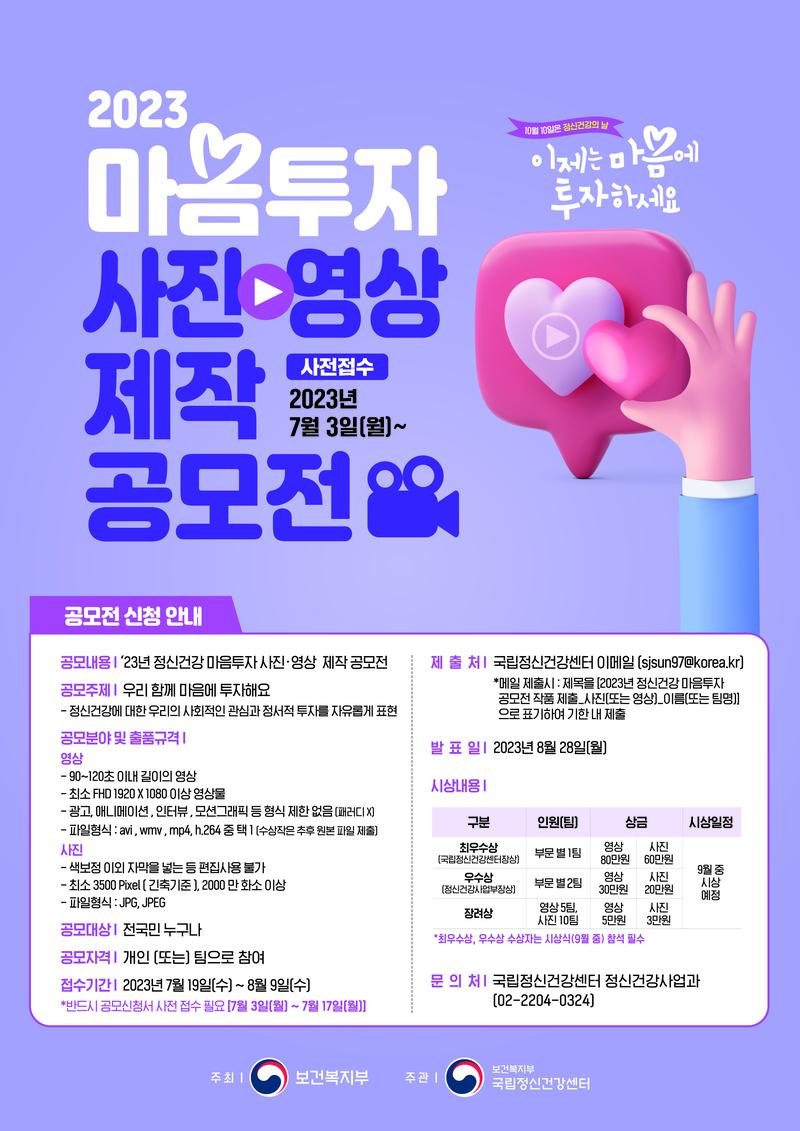 ● 공모 일정 - 공모 신청서 사전 접수 기간 : 23.7.3.(월) \~ 23.7.17.(월) - 공모 작품 제출 기간 : 23.7.19.(수) \~ 23.8.9.(수) - 수상작 발표 : 23.8.28.(월) - 시상식 : 23.9월 중 예정 (수상자는 개별 통지) * 수상작의 경우, '정신건강의 날 기념행사'시 영상 송출 및 사진 전시, 국립정신건강센터 내 사진 전시회 개최, 대중 공개 ** 영상, 사진 부문 모두 최우수상, 우수상, 장려상 작품을 활용