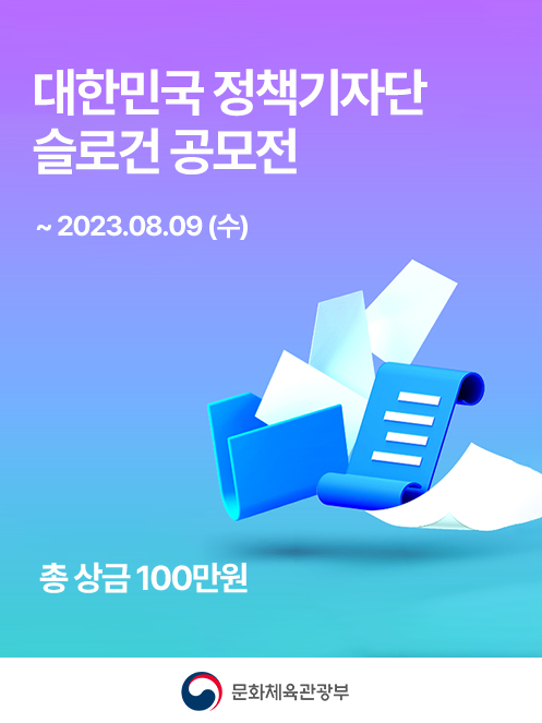 [문화체육관광부 '대한민국 정책기자단' 슬로건 공모전] 대한민국 정책기자단은 대한민국을 대표하는 국민기자단으로, 대한민국 정책을 국민에게 널리 알리고 국민과 소통하는 역할을 수행하고 있습니다. 이에 문화체육관광부에서는 대한민국 정책기자단을 더욱 널리 알리고 국민과의 소통을 도모할 수 있는 슬로건을 공모합니다. 대한민국 정책기자단은 국민의 눈높이에서 정책을 전달하며 국민의 목소리에 귀를 기울이는 메신저로서 역할을 수행합니다. '대한민국 정책기자단'은 정책의 흐름을 읽고 이를 쉽고 생생하게 전달하는 가치를 가지고 있습니다. 이번 슬로건 공모전에서는 '대한민국 정책기자단'의 정체성을 잘 표현할 수 있는 슬로건을 제안해주시고, 이를 통해 많은 사람들에게 알릴 수 있도록 많은 참여를 부탁드립니다.