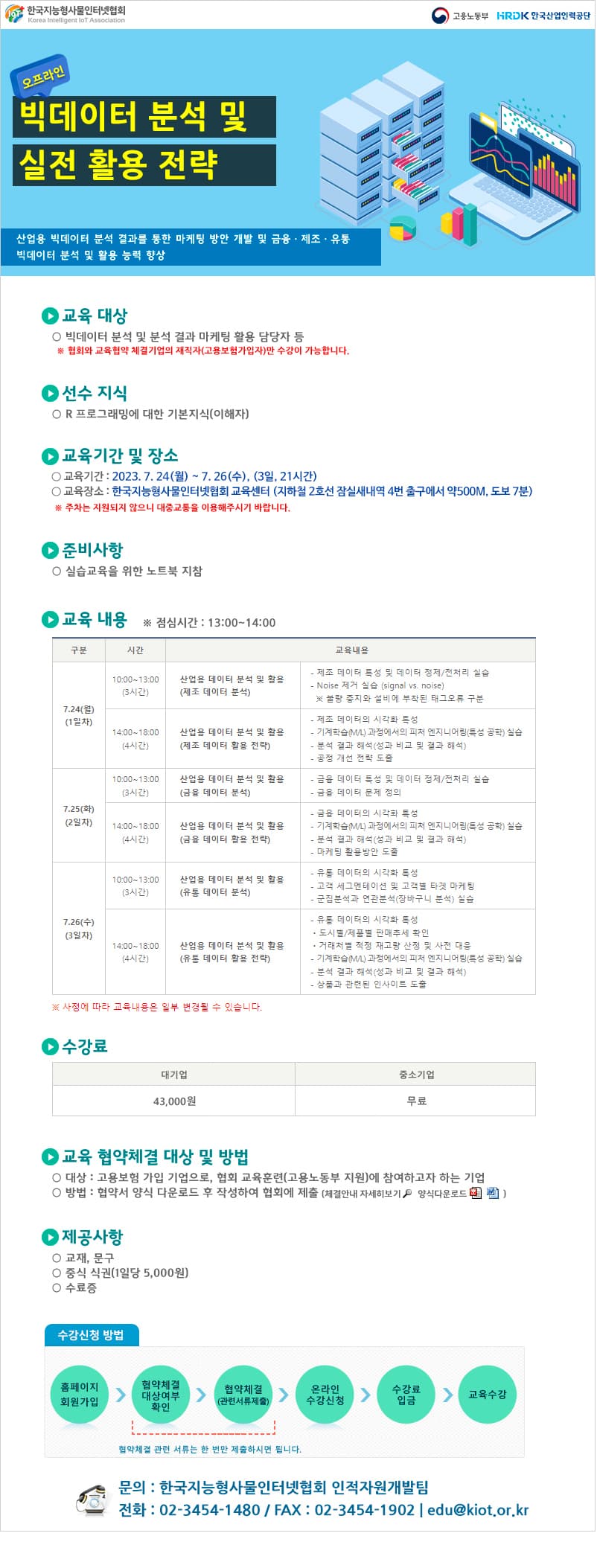 ■ 교육 목표 : 산업용 빅데이터 분석 결과를 통한 마케팅 방안 개발 및 금융ㆍ제조ㆍ유통 빅데이터 분석 및 활용 능력 향상 ■ 교육 대상 :R프로그래밍에 대한 기본지식(이해자) ■ 교육 기간 : 2023. 7. 24(월) \~ 26(수) ■ 교육 장소 : 한국지능형사물인터넷협회 ■ 준비사항 : 실습교육을 위한 노트북 지참 ■ 수강료 : (중소기업 재직자) 무료 / (대기업 재직자) 43,000원