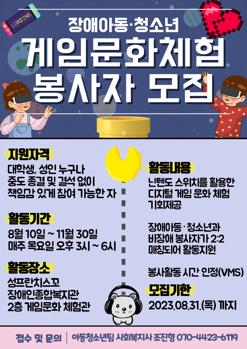안녕하세요. 성프란치스꼬장애인종합복지관입니다^^ 발달장애아동·청소년에게 게임문화체험 기회를 제공하고 정서지능을 향상시키고자 진행하는 프로그램에 함께할 자원봉사자를 모집합니다.