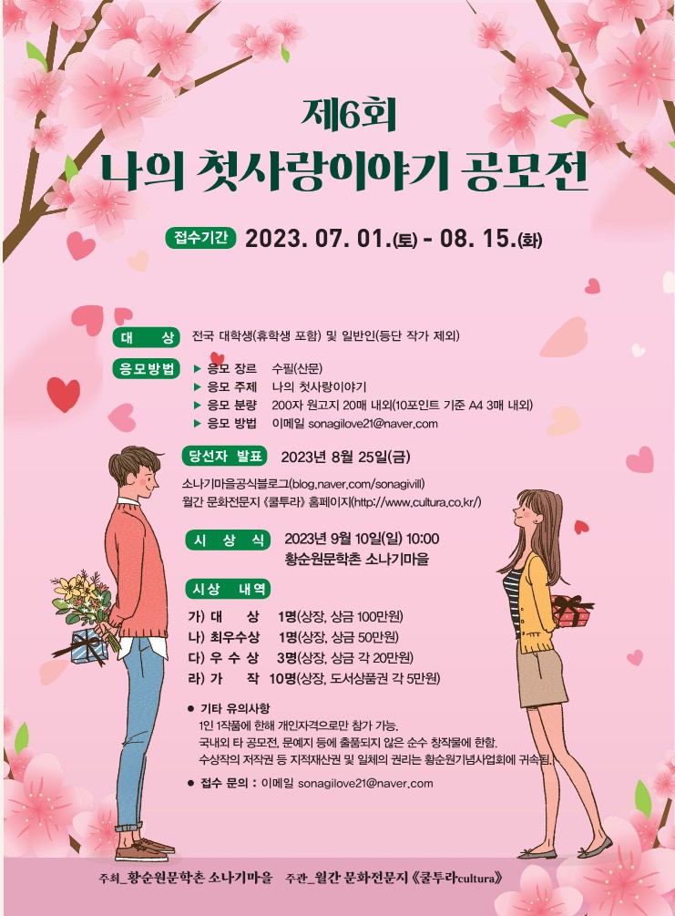 - 당선자 발표 : 2023. 8. 25(금)소나기마을공식 블로그(blog.naver.com/sonagivill)), 월간 문화전문지《쿨투라cultura》홈페이지(http://www.cultura.co.kr/)) 시상식 : 2023. 9. 10(일) 10:00