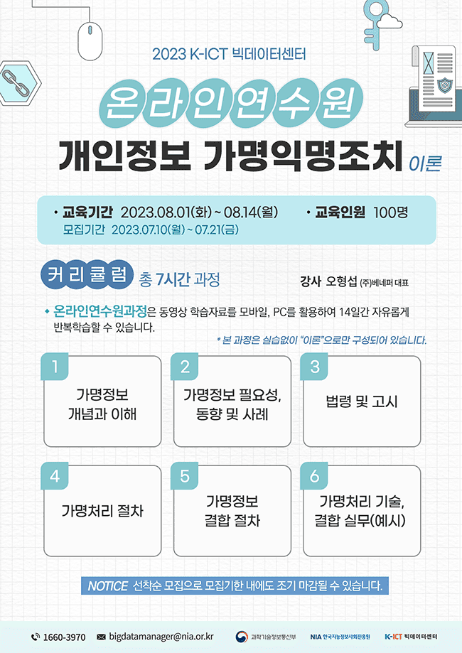 [2023년 8월] 개인정보 가명익명조치 (온라인 연수원과정) ✦접수 및 교육 일정 ·접수기간: 2023. 07. 10(월) \~ 07. 21(금) ·교육기간: 2023. 08. 01(화) \~ 08. 14(월) ✦ 교육방법 동영상 학습자료를 모바일, PC를 활용하여 14일간 자유로운 반복학습 ✦ 혜택내역 ·교육비 전액 무료 ·교육확인증 제공(수료기준: 전 과정의 70% 이상 진행시 인정) ✦ 신청방법 K-ICT 빅데이터센터 홈페이지 ( https://kbig.kr/ ) 회원가입 후 수강신청 *교육대상자 선발 후 교육 불참시 이후 교육신청에 제한될 수 있습니다 * 본 과정은 실습없이 “이론”으로만 구성되어 있습니다.