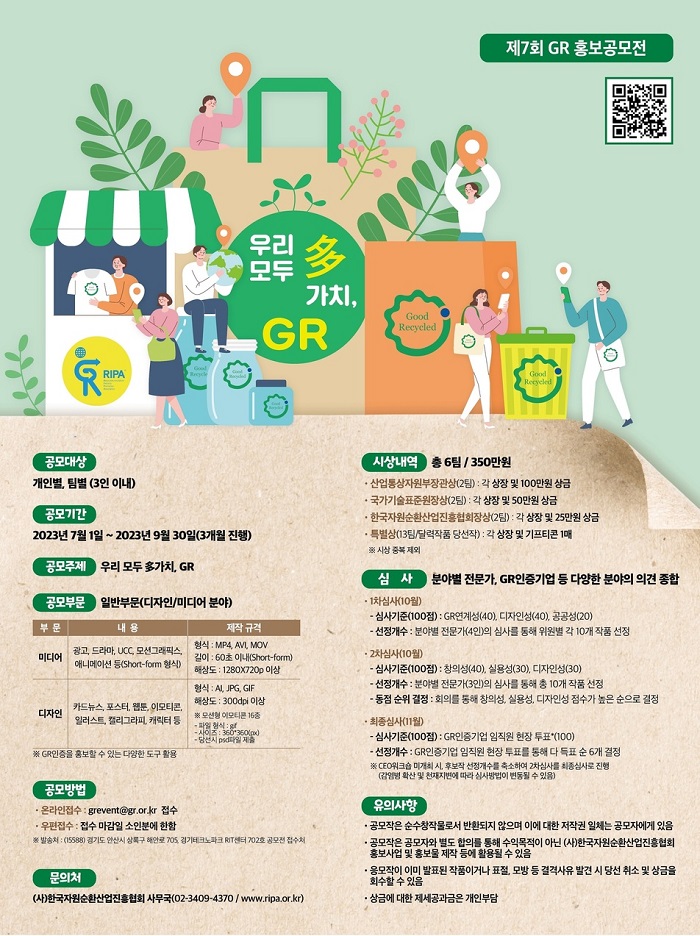 ■ 응모주제 - 우리 모두 多가치\, GR (GR인증 및 제품 홍보 콘텐츠 제작) ■ 응모자격 - 대한민국 국민 누구나(개인별/팀별) ■ 응모일정 - 2023년 7월 1일 \~ 2023년 9월 30일(3개월) ■ 응모부문 - 미디어 : 광고\, 드라마\, UCC\, 모션그래픽스\, 애니메이션 등 - 디자인 : 카드뉴스\, 포스터\, 웹툰\, 일러스트\, 캘리그라피\, 캐릭터\, 이모티콘 등 ■ 접수방법 - 온라인접수(grevent@gr.or.kr) / 우편접수(협회 사무국) ■ 시상내역 - 산업통상자원부장관상(2팀) : 각 상장 및 100만원 상금 - 국가기술표준원장상(2팀) : 각 상장 및 50만원 상금 - 한국자원순환산업진흥협회장상(2팀) : 각 상장 및 25만원 상금 - 특별상(13팀) : 각 상장 및 기프티콘 1매 (시상 중복 제외) ■ 문의 - 협회 사무국(02-3409-4370/ripa@gr.or.kr)